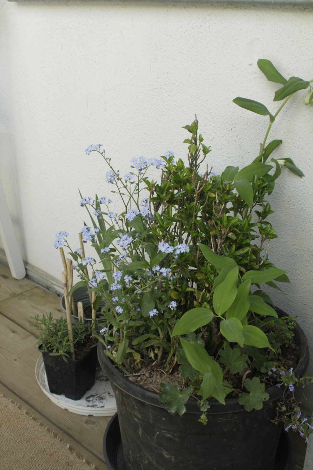 Im Kübel an der Wand wird ein Buchs aus dem Garten gepflegt. Damit er nicht so allein ist, gab es Salomonssiegel, Vergissmeinnicht, Alchemilla xantochlora und Gundermann dazu. Dahinter warten Sumpfschwertlilie und Kriechendes Seifenkraut auf ihren Garteneinsatz.