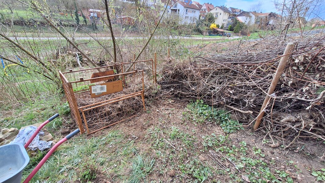 Die eine Seitenwand der Gitterbox bildet jetzt eine verlängerte hintere Rückwand, und vorne ist der Teil halt offen. Die Seitenwand wird durch die Benjeshecke gebildet.