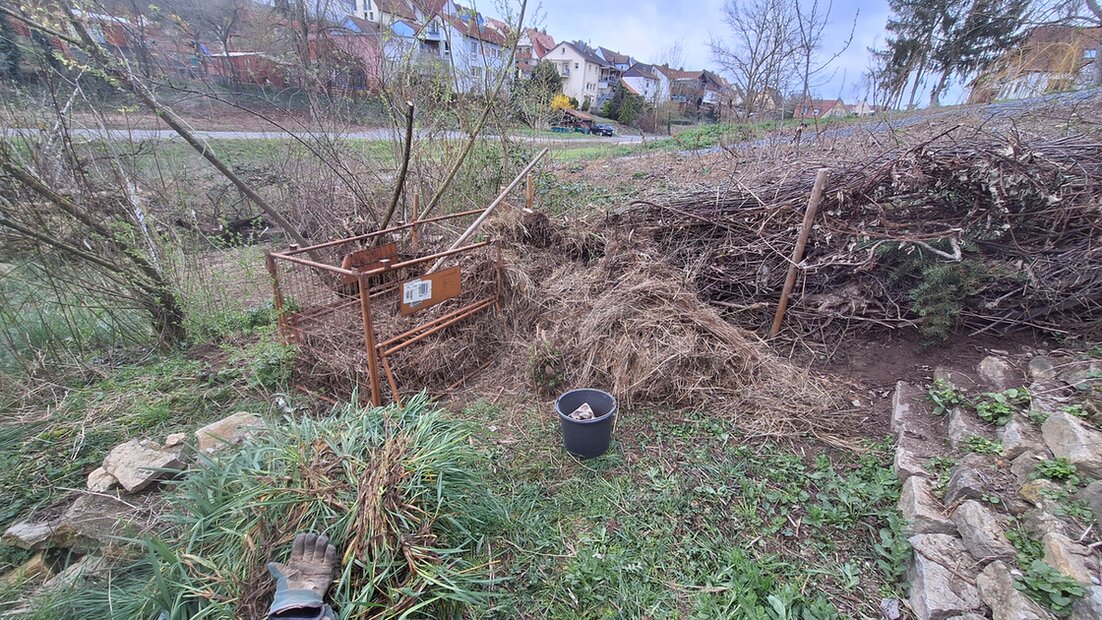 Außen hab ich das trockene Zeug gelassen, damit das Bachgrün nicht weiterwachsen will, ich hab noch einen Eimer Sauerteigwasser dazwischen gekippt, etwas Kaffeesatz und Küchenabfälle, aber das war halt nur von einem Tag.