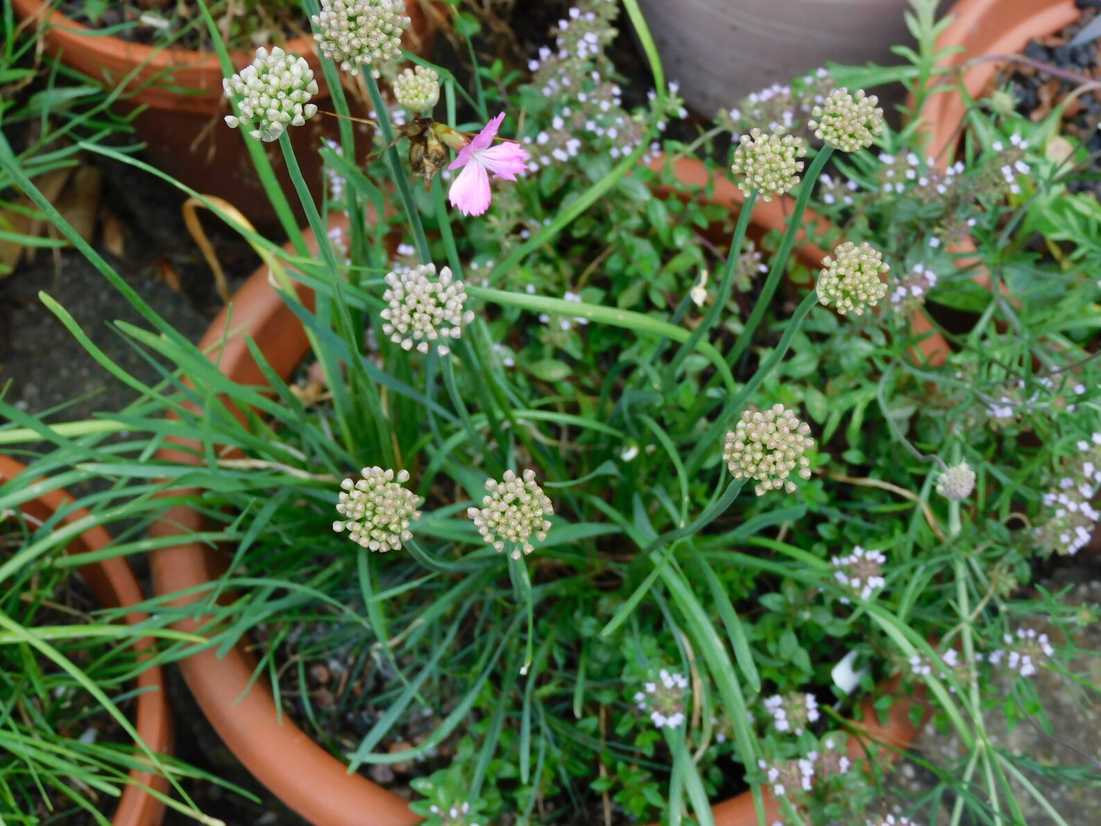Ok, der Topf sah reizvoll aus. Die Nelke begann, sich auszubreiten und bekam neue Triebe aus der Basis. Nur sahen die neuen Triebe irgendwie seltsam aus, ich wurde neugierig, was sich entwickeln würde. Seit kurzem steht fest: es ist ein Lauch! Aber welcher?? Im Nachbartopf steht ein Berglauch, aber der bleibt viel niedriger und blüht auch noch gar nicht. Gegenüber beim Stellplatz befand sich zwar ein Kantenlauch, der jedoch so beliebt bei den Schnecken war, daß er kaum wuchs und nur ein oder zwei kümmerliche Blüten ausbildete letztes Jahr. Ich stellte ihn kürzlich weg aus der Sommerhitze, was ihm nun sehr bekommt, er ist gewachsen und blüht schon. Er ist also mit der Blüte etwas früher dran als mein neuer Lauch, seine Stengel sind dünner und heller (vielleicht sind das aber nur die Nachwehen vom zu heißen Standort zuvor...??)