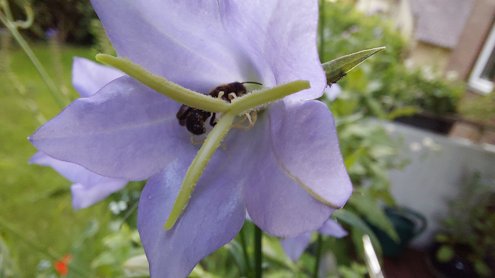 Eine Glockenblumen-Scherenbiene (Chelostoma rapunculi), die es sich in einer Blüte der Pfirsichblättrigen Glockenblume (Campanula persicifolia) zum Schlafen gemütlich gemacht hat ... manchmal knäulen sich sogar gleich mehrere Männchen zusammen in einer Blüte. Die Blüten der Glockenblumen sind nicht nur Nahrung, sondern auch Schlafplatz und bei Regen ein willkommener Unterschlupf ...