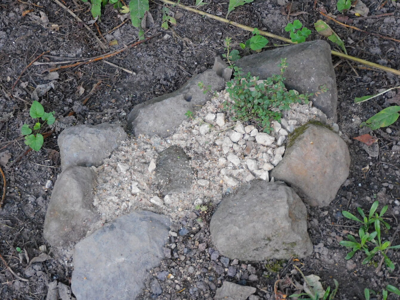 Hier ist mein kleiner Alpensteinquendel zu sehen, dem ich auf die Schnelle eine kleine Steinanlage gefüllt mit Kalkschotter und Sand gebaut habe.