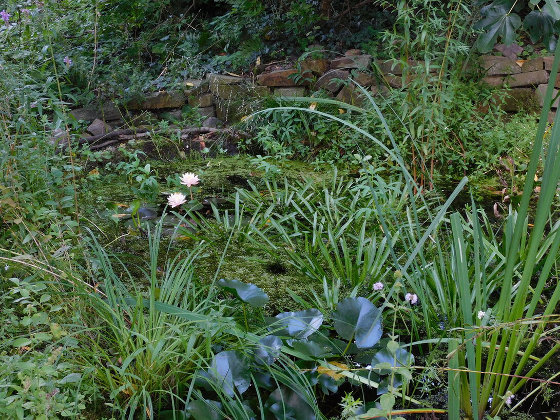 Zur Feier des Tages sind sogar zwei Seerosen aufgeblüht. Im Teich haben wir neulich ein wenig aufgeräumt und das Hechtkraut massiv eingedämmt. Es ist ja ein Nordamerikaner, blüht zwar sehr hübsch und ernährt viele Hummeln, aber es hatte sich viel zu sehr ausgebreitet. Eigentlich wollen wir es nicht mehr haben und der Plan ist, es nach und nach auszurotten. Jetzt ist wieder viel mehr Licht im und am Teich. Das Grüne, was da so herumschwimmt, sieht zwar aus wie Wasserlinsen, es sind aber einfach Überreste von Blüten vom Blutweiderich und anderen Gewächsen, die in den Teich fallen.