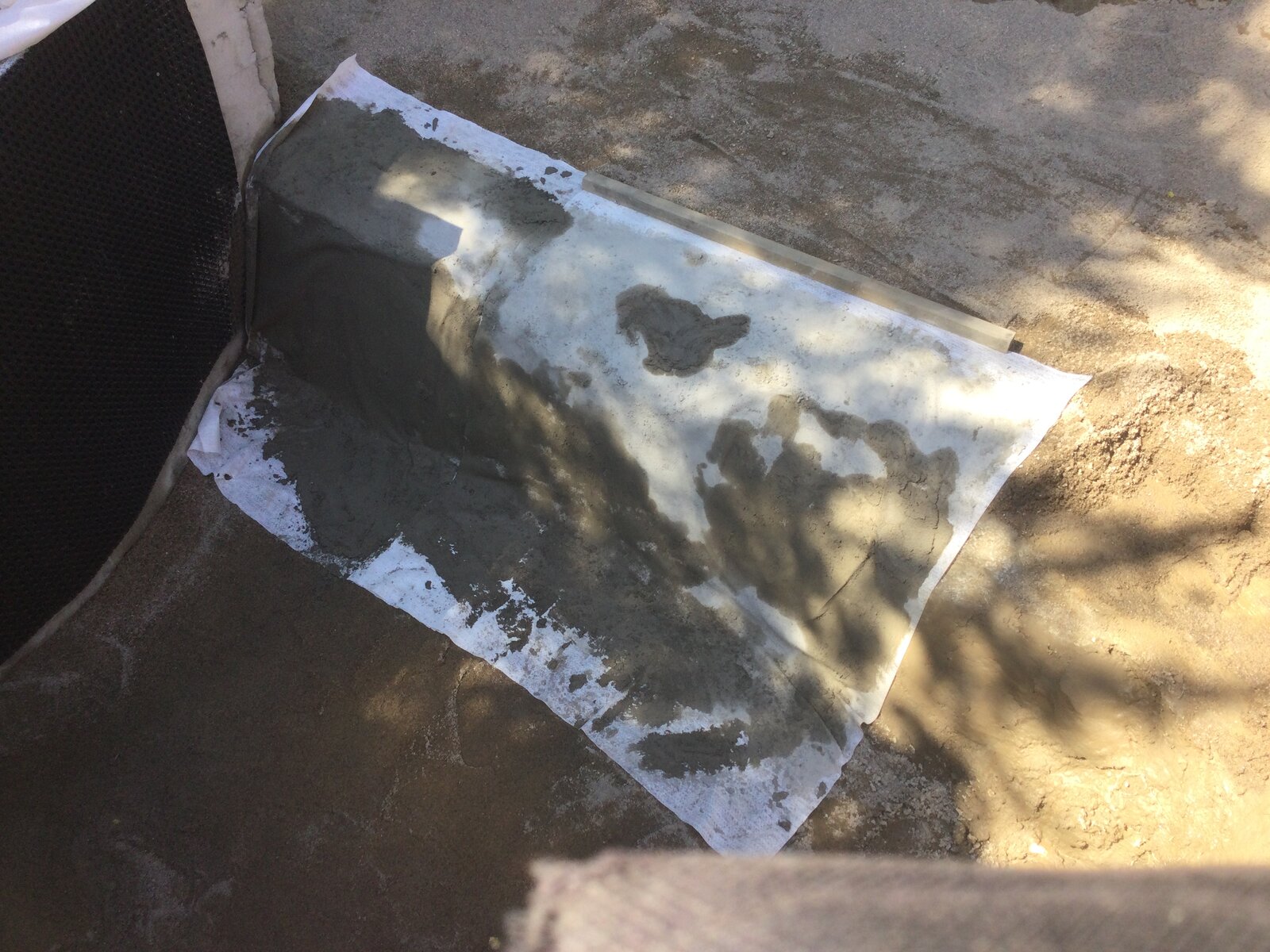 Zwei dünne Streifen habe ich verlegt und mit Mörtel geschlemmt, die schon teilweise getrocknet ist. Ich hoffe, dass es die Kante etwas Stabilität gibt. Man weiss ja nie wie lange das Wetter hält.... :flucht