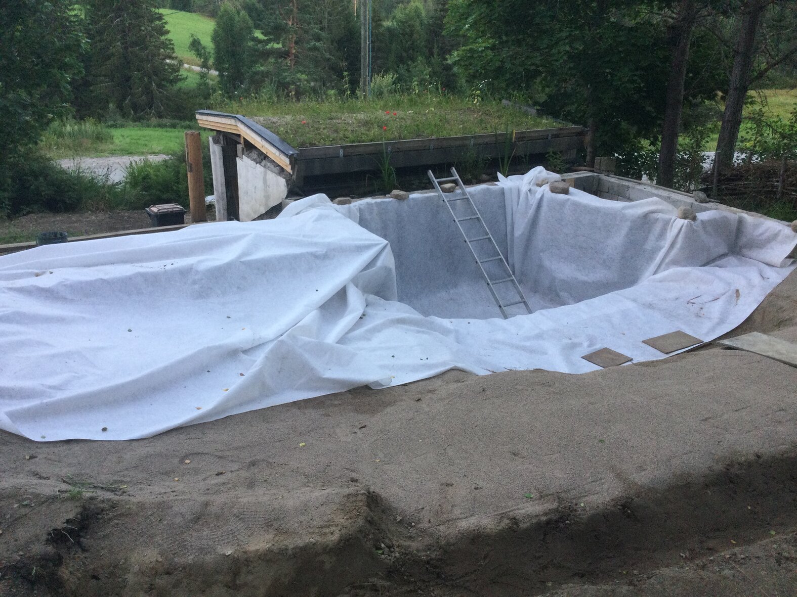 Heute habe ich die Schäden in der Steilwand repariert und angefangen das Schutzvlies zu verlegen. Morgen bekomme ich Hilfe von Freunden bei der Verlegung von der Teichfolie. Alles ganz schön schweisstreibend bei 26˚... Auch in Norwegen kann es warm sein. Sonntag fängt es aber schon wieder an zu regnen und deswegen mache ich echt drei Kreuze, wenn die Folie an ihrem Platz ist
