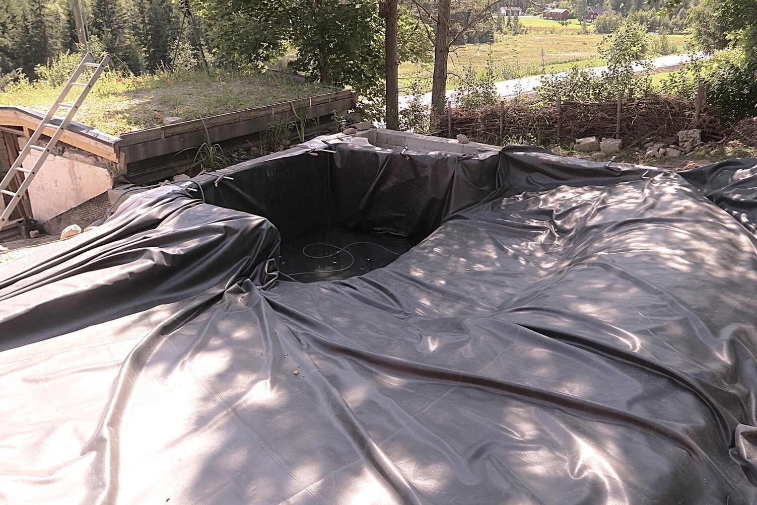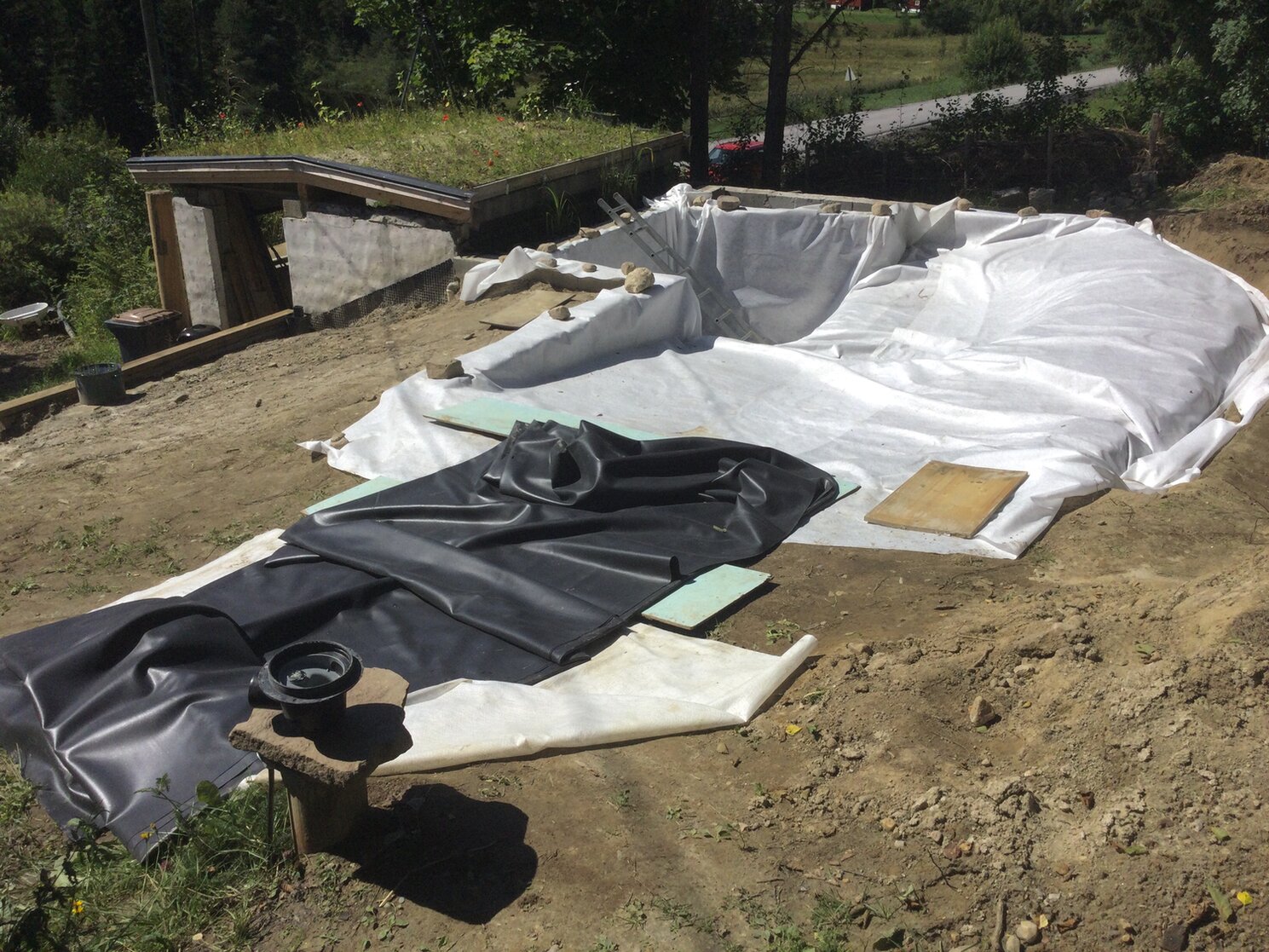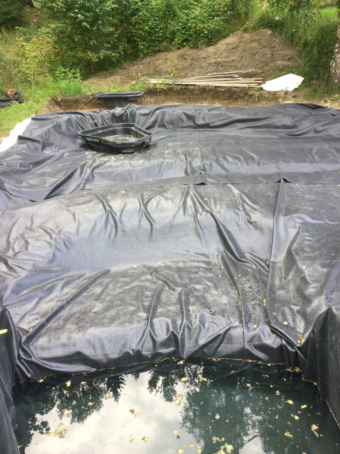 Die Folie, die ich benutze und auch weiter empfehle besteht aus EPDM, Kunstkautschuck. Die ist Temperatur unempfindlich. Und die haben wir heute verlegt. Eine andere viel genutzte Variante besteht aus PVC. Auch wenn die angeblich heute zu Tage ohne giftige Weichmacher produziert wird, bin ich generell skeptisch, was der Chlorchemie angeht.