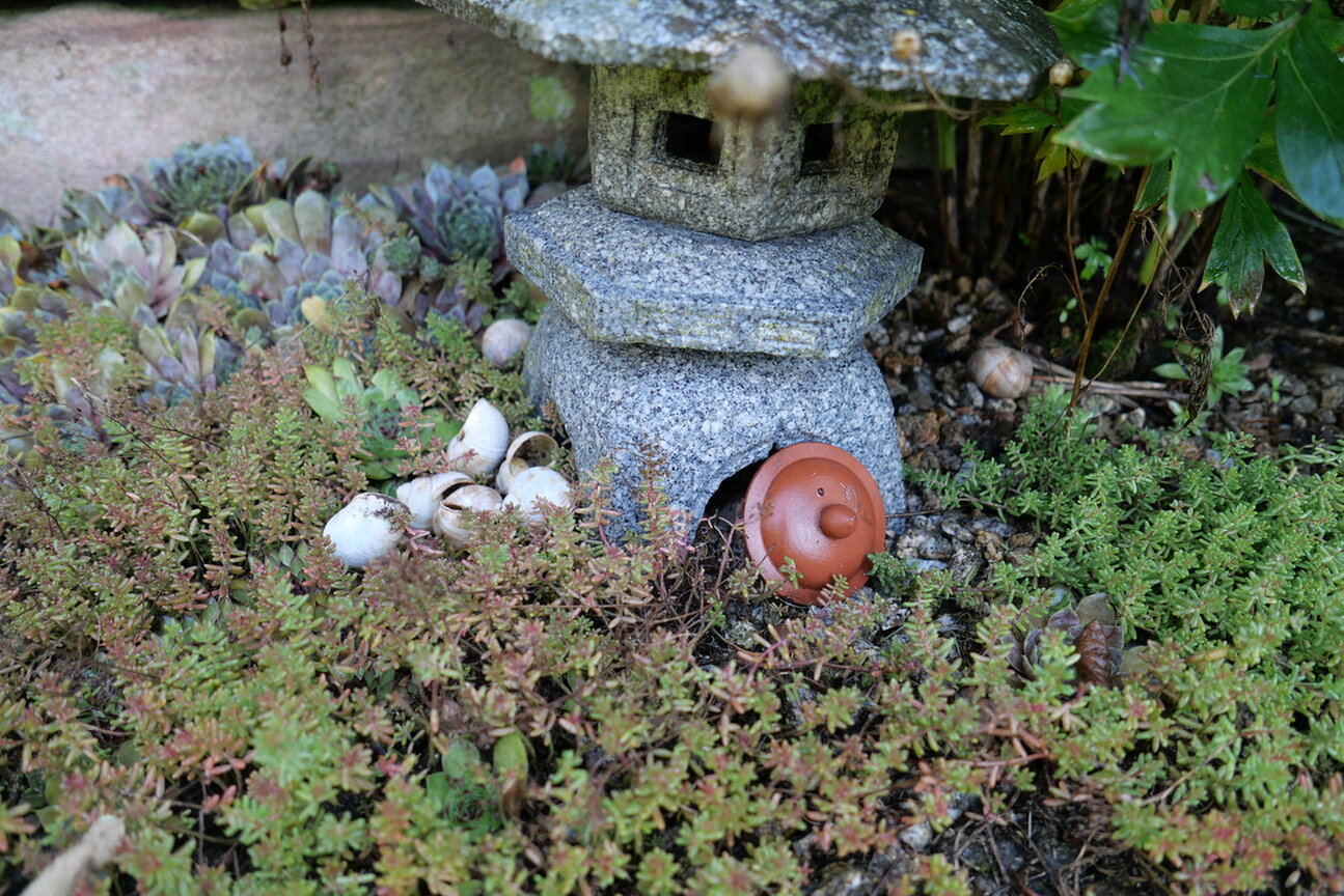 Schneckenhäuser: ich finde sie im Schatten, da bleiben sie nur liegen und zersetzen sich. An der alten Stelle spielten die Mäuse damit. Nun eben mal hier.