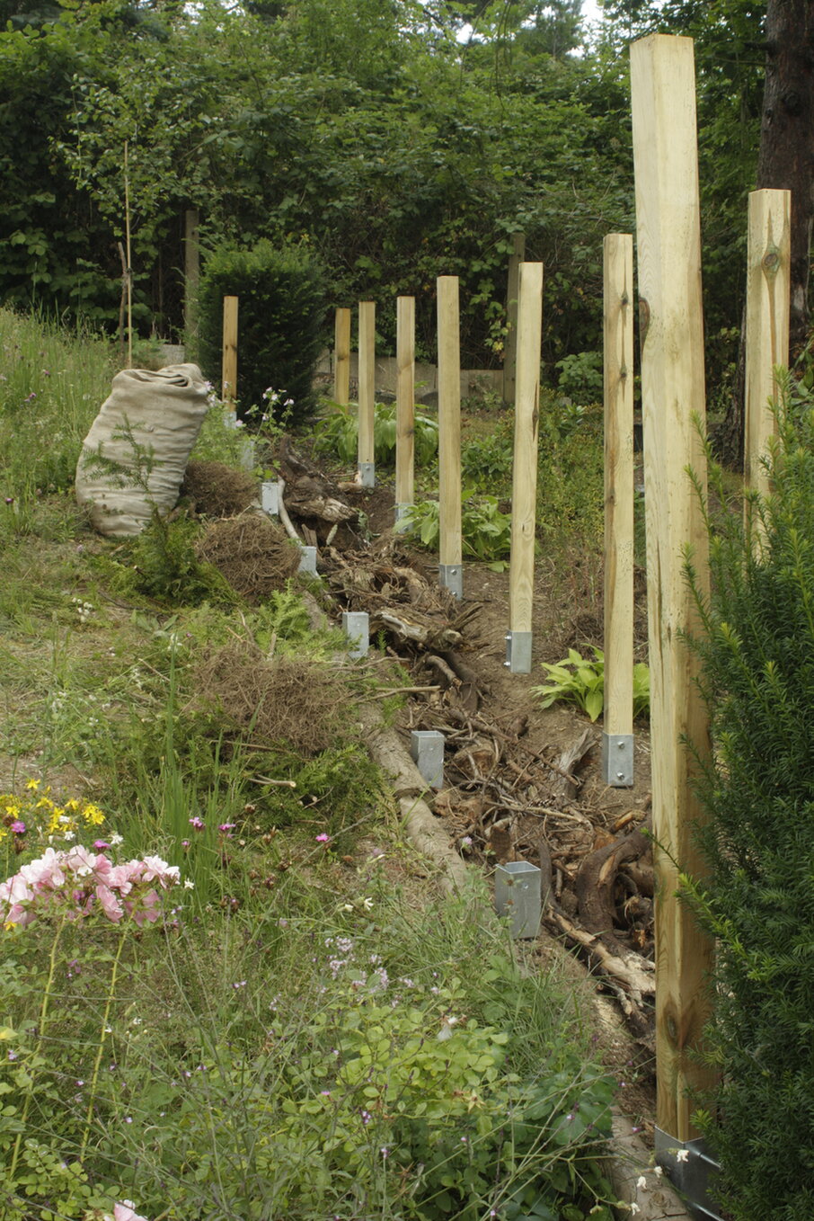 Ursprünglich wollte ich die Oberkante waagerecht machen, damit es in dem Garten mal eine gerade Linie gibt. Ich fühle mich manchmal seekrank. Dann wäre ich oben aber bei optisch lächerlichen 40cm rausgekommen. Es wurden 80cm. Unten ist sie 1,8m hoch.