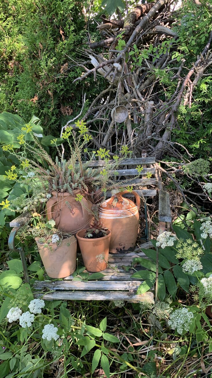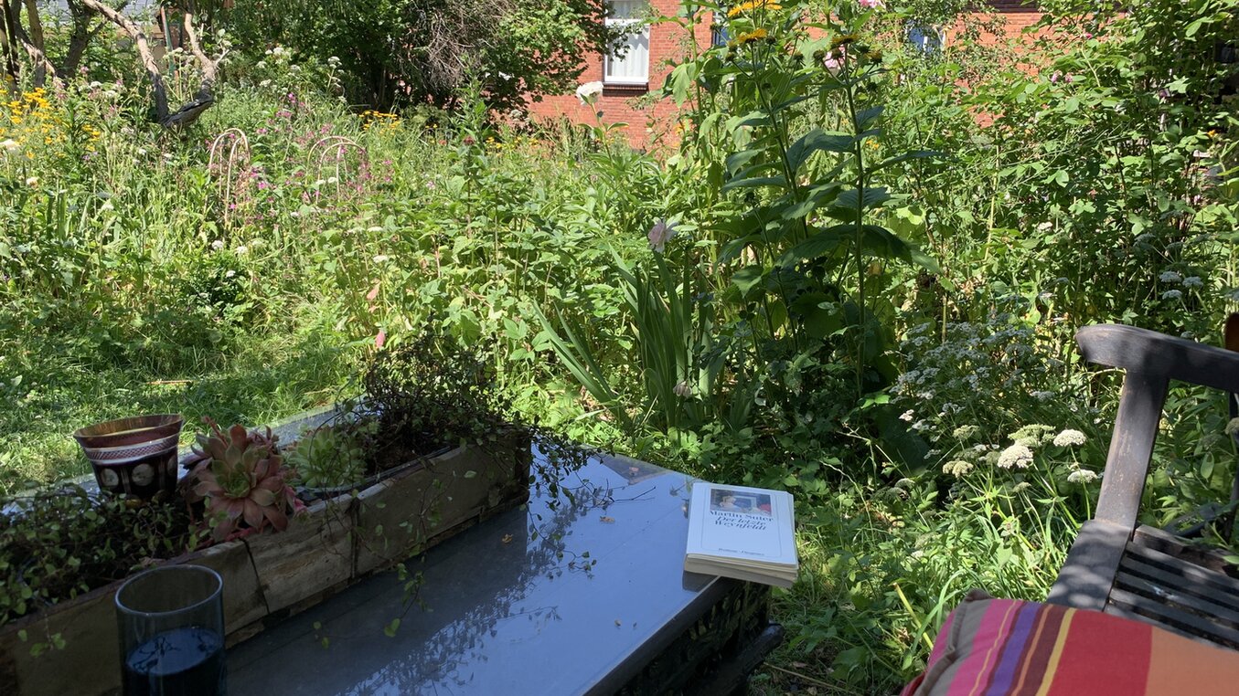 An der Holzwand wachsen in Töpfen clematis, passionsblume, in Töpfen, neben allerlei anderen Pflanzen, an der Hauswand Efeu und Pfeifenwinde.