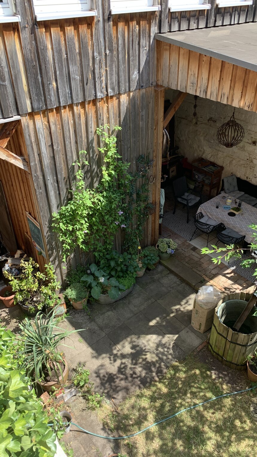 Im Hof gibt es auch eine Zierkirsche und Holunder, einen alten Flieder, in dem auch eine clematis wächst, eine noch kleine Mispel und Sommerflieder, eine feige und noch anderes.