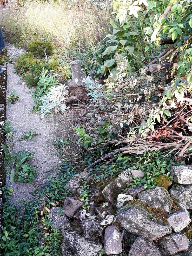 1. Durch den Garagenabriss hatte ich eine Mulde, in welcher Stumpery, Magerbeet, Steinhaufen, Käferkeller und Flachteich gemütlich von unten nach oben aufgebaut werden konnten ohne zu buddeln.