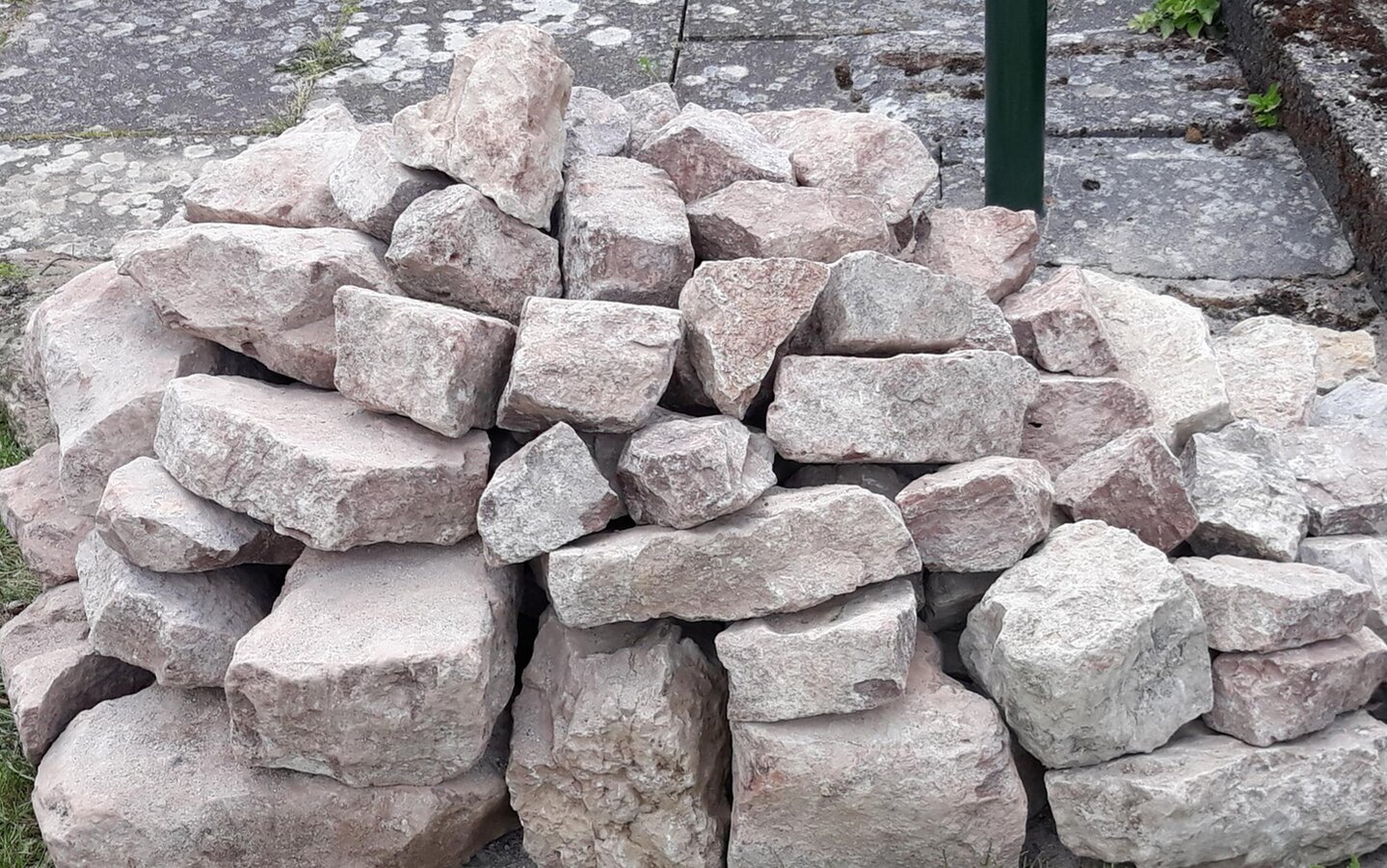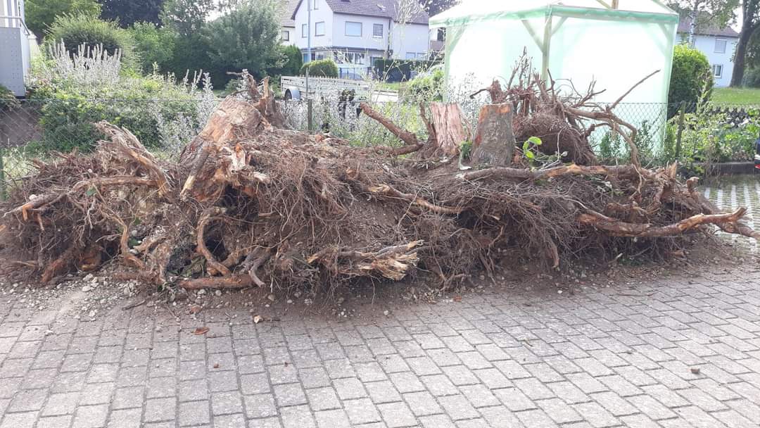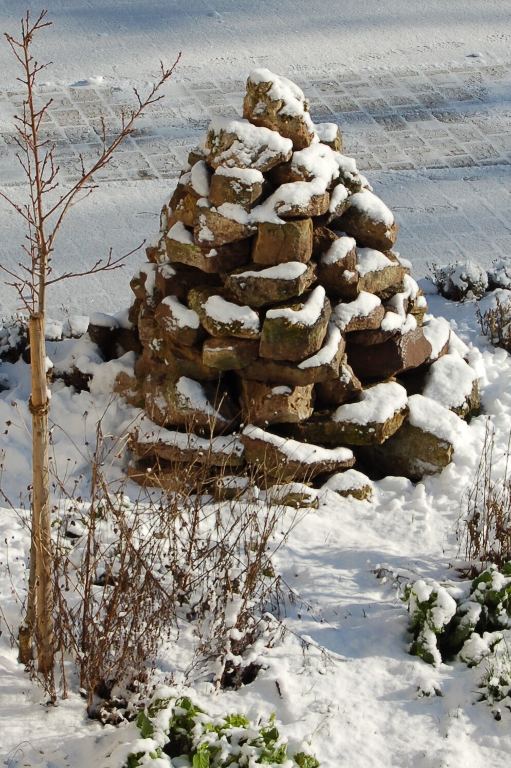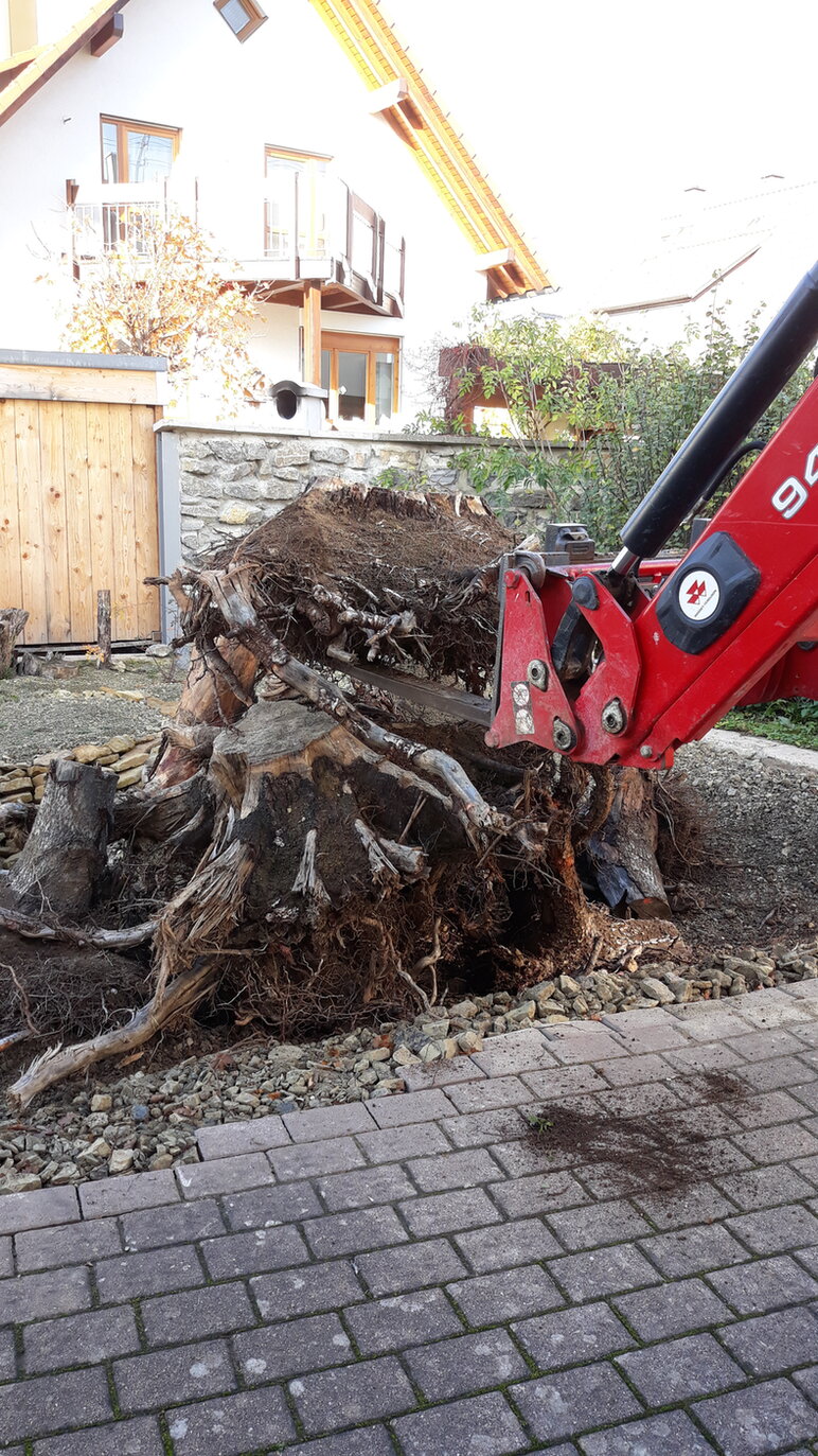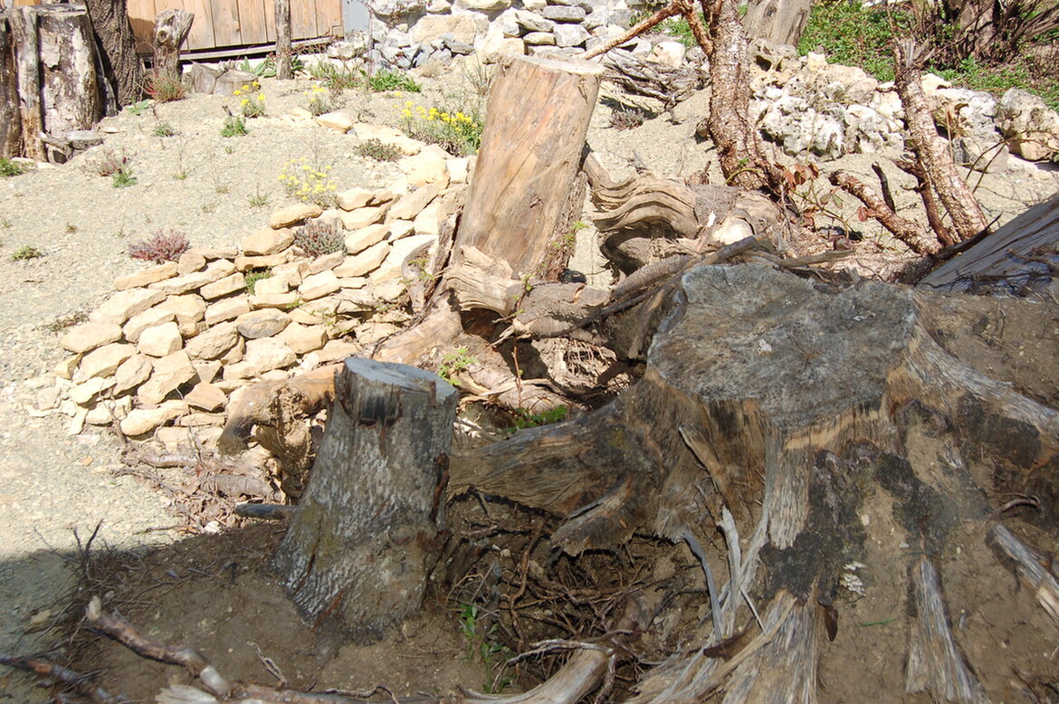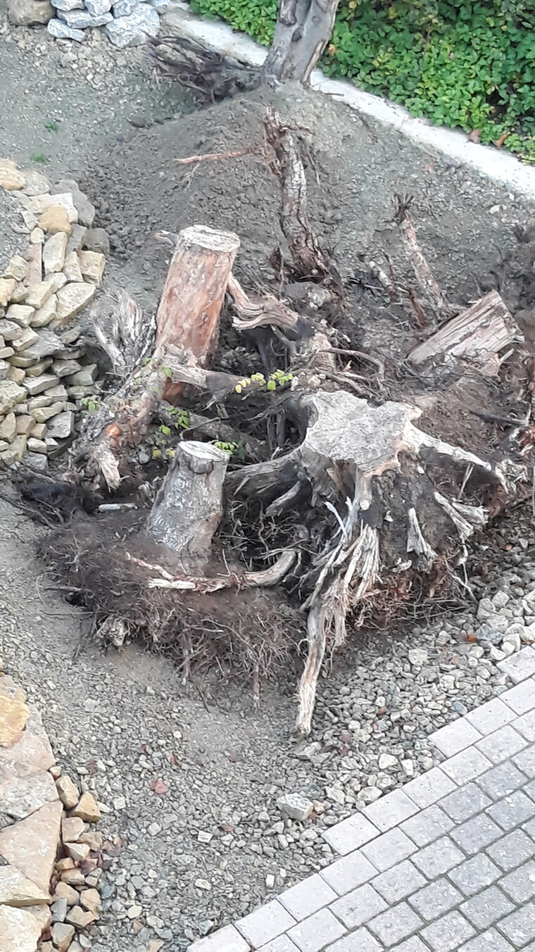 Ich ließ mir vom Abrissunternehmen kostenlos große Wurzeln in den Hof kippen. Ein Landwirt stapelte sie mir dann - ebenso kostenlos - hübsch auf.