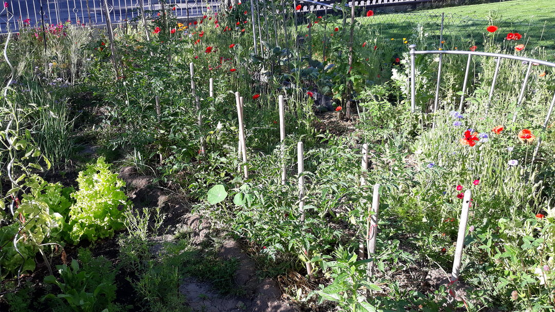 Ein Teil des Gemüsegartens legte ich nach einer Idee von Kurdyumov an: Schmale Beete und breite Wege. Dort konnte ich alle Grassoden bei der Beseitigung des Rasens gleich sinnvoll verwenden. Sie bilden Rahmen, die mit Mulchmaterial aufgefüllt werden. Auf den Wegen dürfen Wildkräuter wachsen und blühen, solange sie nicht stören, und liefern wiederum Mulchmaterial.