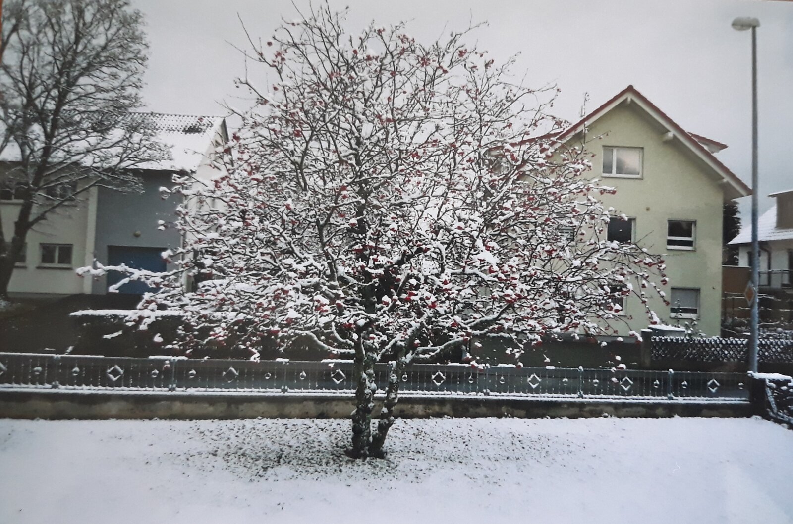 "Halbwild" ist die Rose Ballerina, welche mehrmals im Jahr blüht. Sie hat zum Winterbeginn noch Blüten, grüne und rote Hagebutten gleichzeitig an den Zweigen.