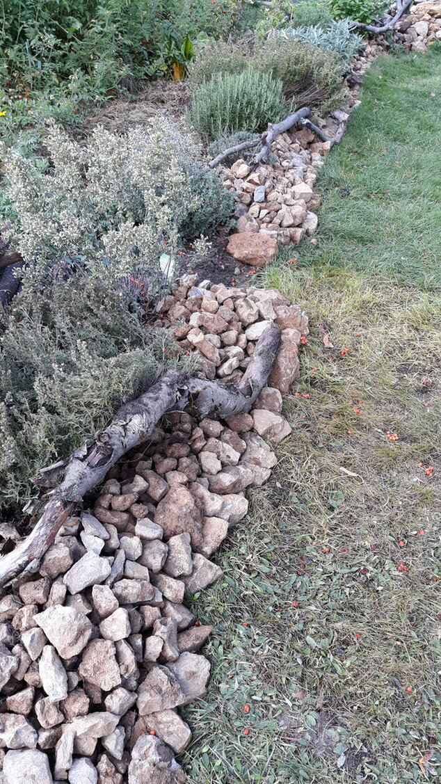 Am Sitzplatz, dem letzten kleinen Rasenstück im gesamten Garten, hindert ein Steinriegel das Gras daran, die Gemüsebeete zu überwuchern. Der Schotter stammt aus rückgebauten Schottergärten in der Umgebung.