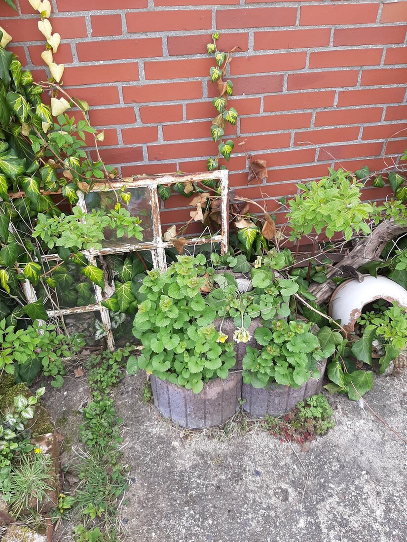 Steinhaufen, Blähtonsteinmauer, unterhöhlte, teilweise eingebrochene Steintreppe, die älteste auf dem Hof befindliche alte Ziegelmauer (ca 2-300 Jahre alt) mit stark defekten, teilweise fehlenden Fugenfüllungen) durch Efeu geschützt ist so belassen worden. Da es sich nicht um eine Mauer zu Wohnräumen handelt und keine tragende Wand ist, habe ich zugunsten der tierischen Bewohner auf die Sanierung dieser Wand verzichtet.