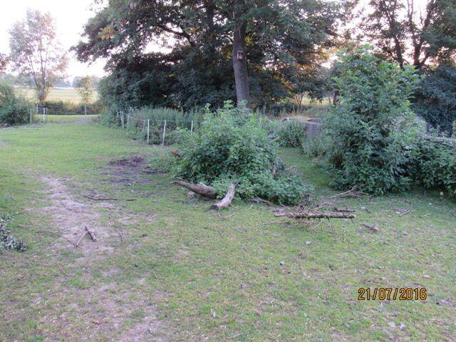 Misthaufendurchgang - links unten der Durchgang zum alten Pflaumenpaddock (hinter dem Misthaufen sieht man ihn), rechts unten der vordere Teil des 2008 ter Fotos (man sieht rechts im Bild noch ein Stück Misthaufenmauer) und oben der hintere Teil der 2008er Durchfahrt, wo die 3 Eschen stehen.