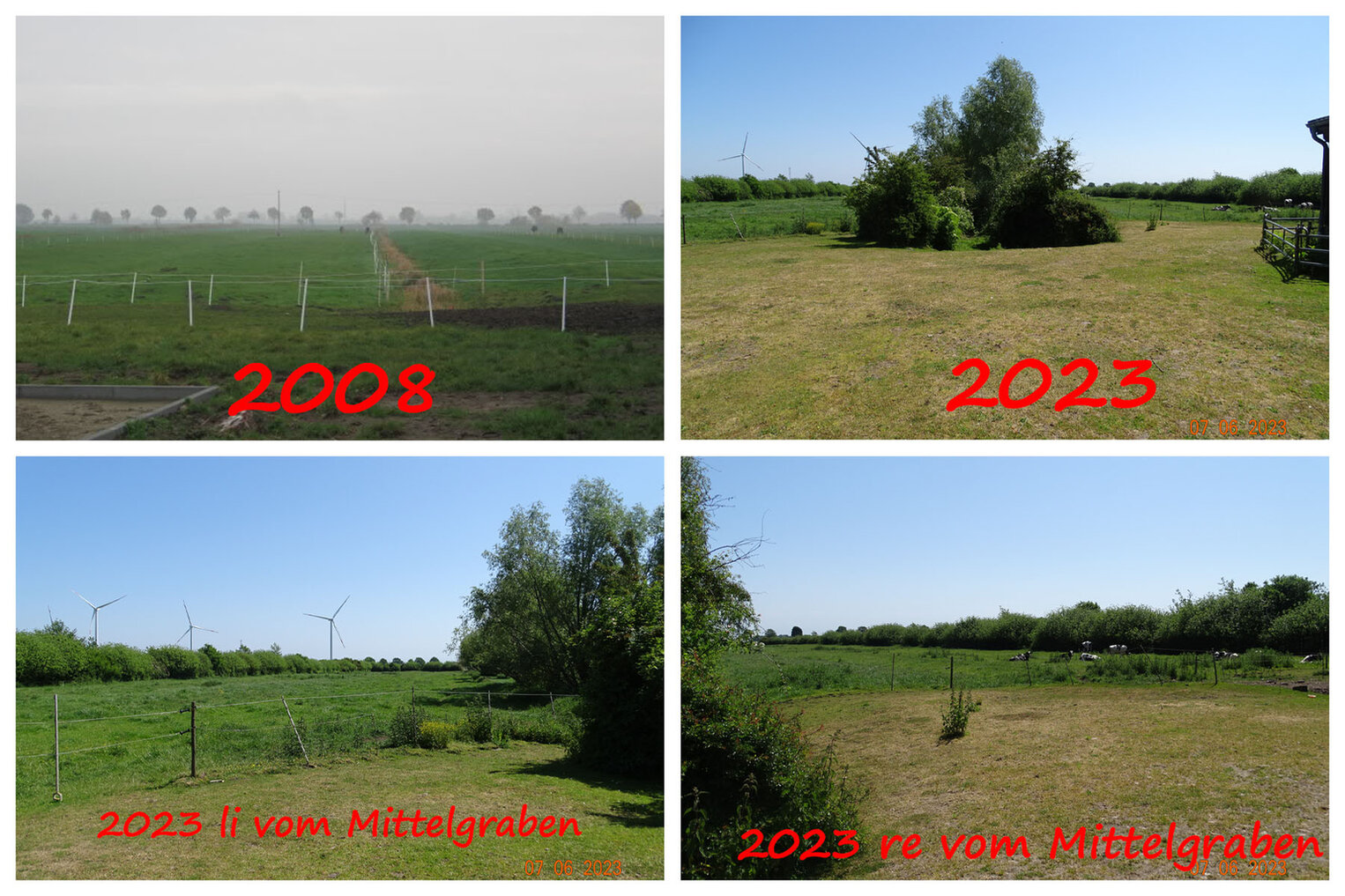 Die hinteren Koppeln wurden zudem mit einem 8 Meter breiten Knick „eingezäunt“ und am Mittelgraben mit einer ungeköpften Weidenreihe bepflanzt.
