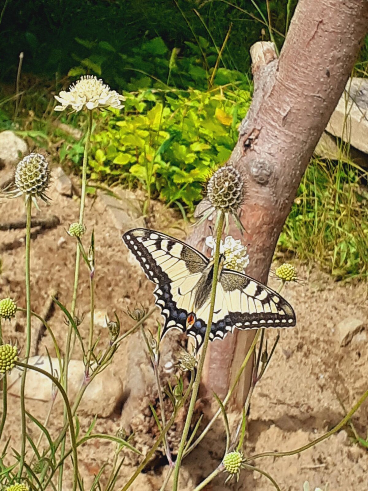 3 Wildblumenbeeten, in denen wir regionale Saatgutmischungen von TGTA und WildLand ausgebracht haben, das Sandarium, unserem Kräuterrasen (wir haben schon vor 4 Jahren aufgehört zu mähen und mähen jetzt nur noch 1-2x im Jahr. Zusätzlich hat mein Mann dieses Jahr einen Sensenkurs besucht, damit wir noch schonender abmähen können) und einem mehrstufigen Staudenbeet.