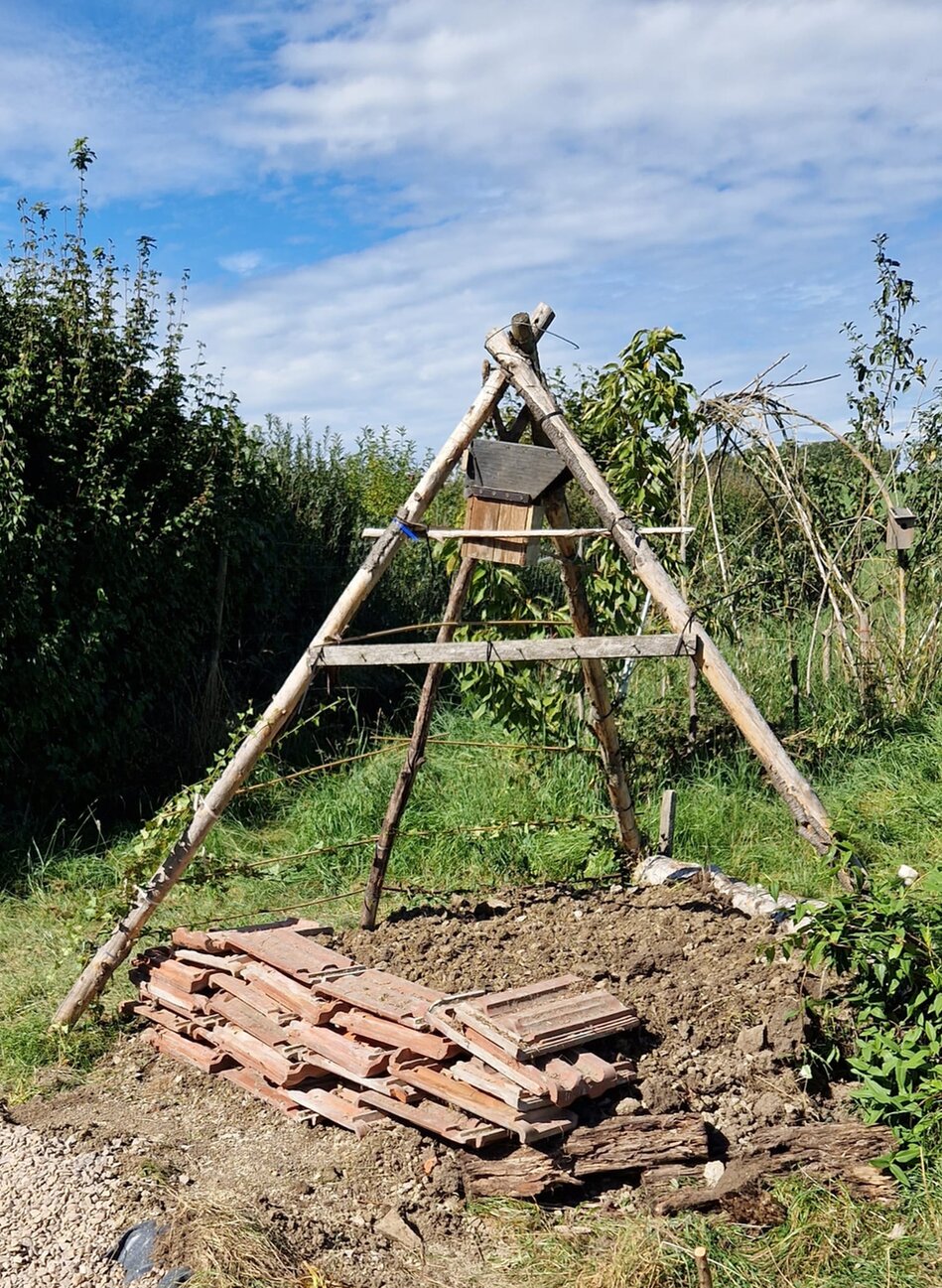 Die Ertragszone ist kein abgeschlossener Bereich, sondern zieht sich durch den gesamten Hortus. Walnussbäume, Apfel, Birnen, Zwetschgen, Kirschen, eine Mispel, Aprikose, Feige, Beerensträucher und drei große Holz-Hochbeete sind verteilt au dem gesamten Gelände. Außerdem gibt es auch ein paar Hennen und ihren Hahn. Auf unserem Grashaufen sammeln wir alle pflanzlichen Reste des Hortus. Außerdem haben wir einen Komposter für sonstiges.