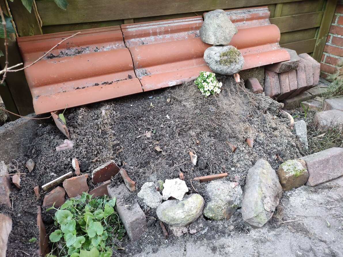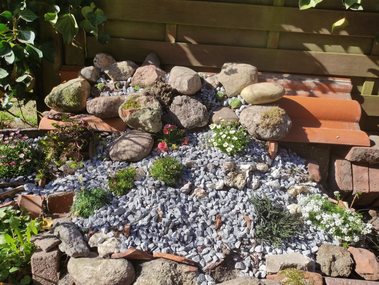 Dann wurde mit Dachziegelschutt eine Drainageschicht in Form von Spalten gelegt. Spalten sind wichtig für ein Alpinum, da die meisten Pflanzen der Gebirge Tiefwurzler sind.