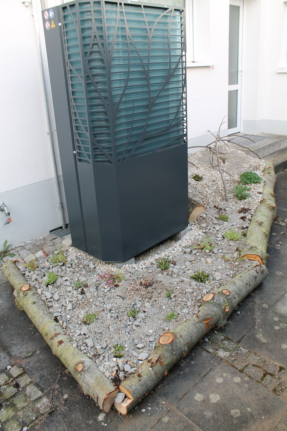 Ich finde das viel schöner, als der Wärmepumpe eine Plastikhaube überzustülpen, um sie vor Blicken und Anrempeln zu schützen, und ich hoffe, dass die Insekten da mitziehen.