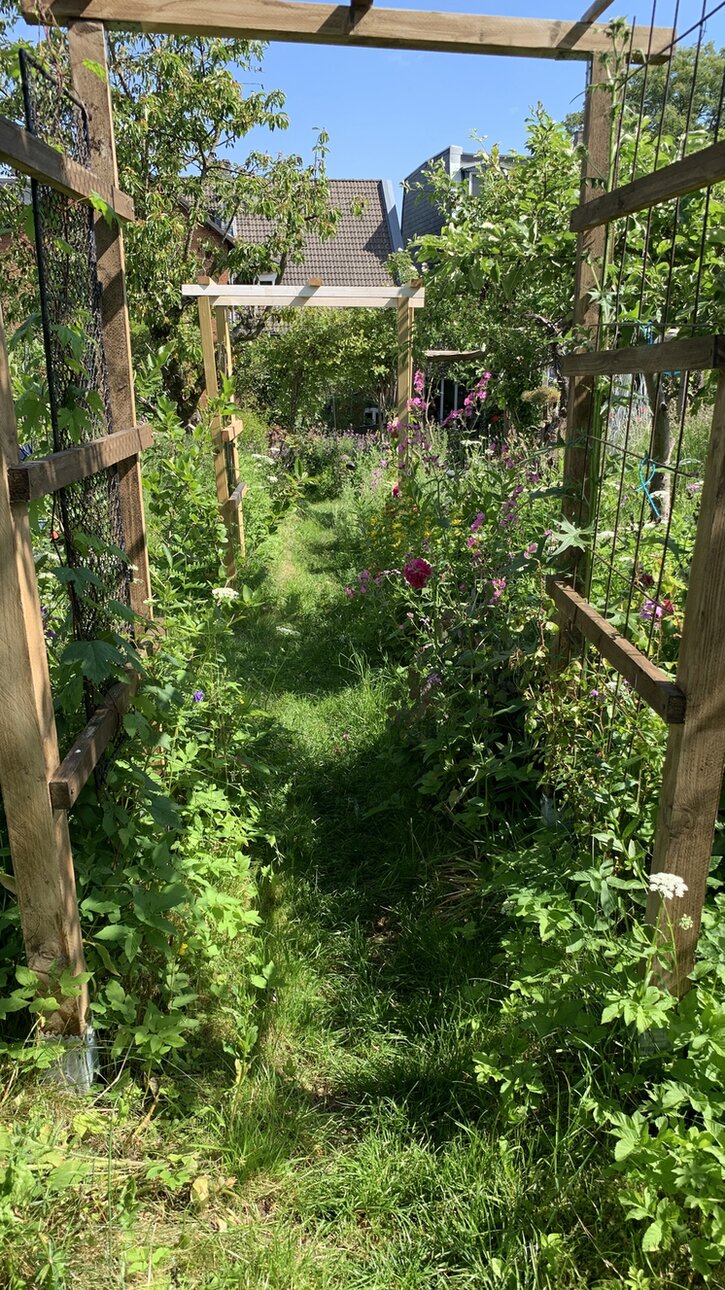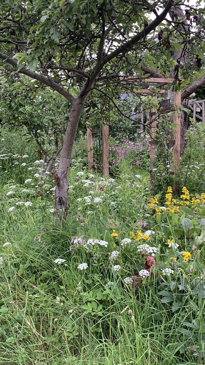 Die Hecken im eigentlichen Garten habe ich in den letzten Jahren etwas umgestaltet- Richtung Westen besteht eine etwas schwierigere Nachbarschaft- unsere Sträucher möchten den Maschendrahtzaun bitte nicht berühren. Dann ist der Garten sehr schmal und deshalb ist der Platz begrenzt. Dort gab es wegen den Nachbarn thujas, die ich in den letzten Jahren entfernt habe.es gibt erst eine große hasel. Dann ist ein Cornus eingegangen, wahrscheinlich ist er mit dem Klimawandel nicht klargekommen, er ist vertrocknet. Es gibt weiter ein Goldregen, in die Wilde Rose wächst ein bauernjasmin, eine spiere, eine alte Rose, eine zierjohannesbeere( lieblingspflanze meines Mannes) , eine rambler, eine weigelie, eine alte Sauerkirsche, eine Johannesbeere, eine chinesischer cornus ( Früchte essbar), kartoffelrosen, 4 hainbuchen, ein Rotdorn, 2 rispenhortensien ( Geschenke) , eine wilde Pflaume, hundsrosen, noch eine Johannisbeere, unausrottbare Knallerbsen, eine pimpernuss und Himbeeren. Richtung Süden gibt es ein Holunder, Hainbuche vom Nachbar, Himbeeren, ein Zaun mit Efeu und Hopfen und auch eine josta. Aber auch Freiflächen, weil einerseits die Sonne für die Gemüsebeete brauchen und andererseits gerne mit den Nachbarn kommunizieren, die auch naturnah gärtnern und dort ihre Bienenstöcke stehen haben. Im Osten wird unser Garten von einer großen hasel, eine kollwitzie, spieresträucher, thujas, die ich als windschutz stehen lasse ( der Ostwind ist manchmal böse) eine felsenbirne, eine wilde Pflaume, ein alter Zwetschgenbaum mit einer Rambler, totholzhecken (4) , Brombeeren, kartoffelrosen, Fallbaum, 4 kleinwüchsige Apfelbäume, ein Gewürzstrauch, ein Holunder, ein Ahorn, der sich selbst angesiedelt hat und den ich klein halte, weil er zwar schön den Kompost beschattet, aber wenn er zu groß würde, die ertragzone massiv verändern würde. Die totholzhecken werden von geissblatt begleitet. In der Ecke ostsüd wächst ein alter Zwetschenbaum über dem Kompost. Als wir das Haus vor fast 30 Jahren kauften, waren viele Obstbäume schon vorhanden.4 Apfelbäume standen an de Grenze Ost. Ich habe sie gelassen. Der mittlere Teil des Gartens ist sozusagen durchwachsen. Es gibt noch 3 Apfelbäume , die ebenfalls niedrig wachsen. Ich habe 2 umgesetz und vor 3 Jahren noch 3 Mirabellen gepflanzt, die noch klein sind. Eine vorhandene Sauerkirsche ist mittlerweile ein habitatsbaum. Eine sehr große Zwetschge, deren Stamm ich nicht umfassen kann, ist seit Jahren in der Mitte komplett kahl, ein mächtiger Nebenarm hat sich vor 3 Jahren, behangen mit Früchten verabschiedet. Aber, obwohl sich der Stamm hohl anhört, Gras aus ihm wächst, die Spechte und andere Vögel seit Jahren Löcher bohren, trägt er an einem Nebenarm Blüten und Früchte. Es gibt schon Spalten im Holz und wir fragen uns, ob wir die Fläche bei Open- Garden - Veranstaltungen absperren sollten? Dieser Riese ist unser 1. klasse - Insektenhotel. Und er ist ein Lieblingslandeplatz für Vögel. Ich habe jetzt ein geissblatt, den ich umpflanzen musste, ihm zur Seite gestellt. Aber, es gibt ja immer ein aber, der große Ast, der vor 3 Jahren abgebrochen ist, hatte unsere Hochbeete und das Gewächs vor der intensiven Mittagshitze geschützt/ beschattet. Etwas, was ich im Verlauf des Klimawandel gelernt habe- Zuviel Hitze geht auch nicht. Es ist ein ständiges abwägen. Aber dazu später. Was gibt es noch? Eine kleine Ölweide, noch ein aufgeasteter bauernjasmin, 2 aufgeastete Flieder, die schon da waren, als wir das Haus vor fast 30 Jahren kauften, ein pfaffenhütchen, noch eine josta, Johannisbeeren, eine große Kirsche , die kaum trägt, weil sie monilia hat, aber wunderschön blüht, Schatten spendet und unsere Hängematte trägt, eine Mini- Eiche, die sich ausgesät hat. Achja, es gibt noch einen Perückenstrauch, der jahrelang geschwächelt hat und jetzt mit den Wetterphänomen erstaunlich gut klarkommt?