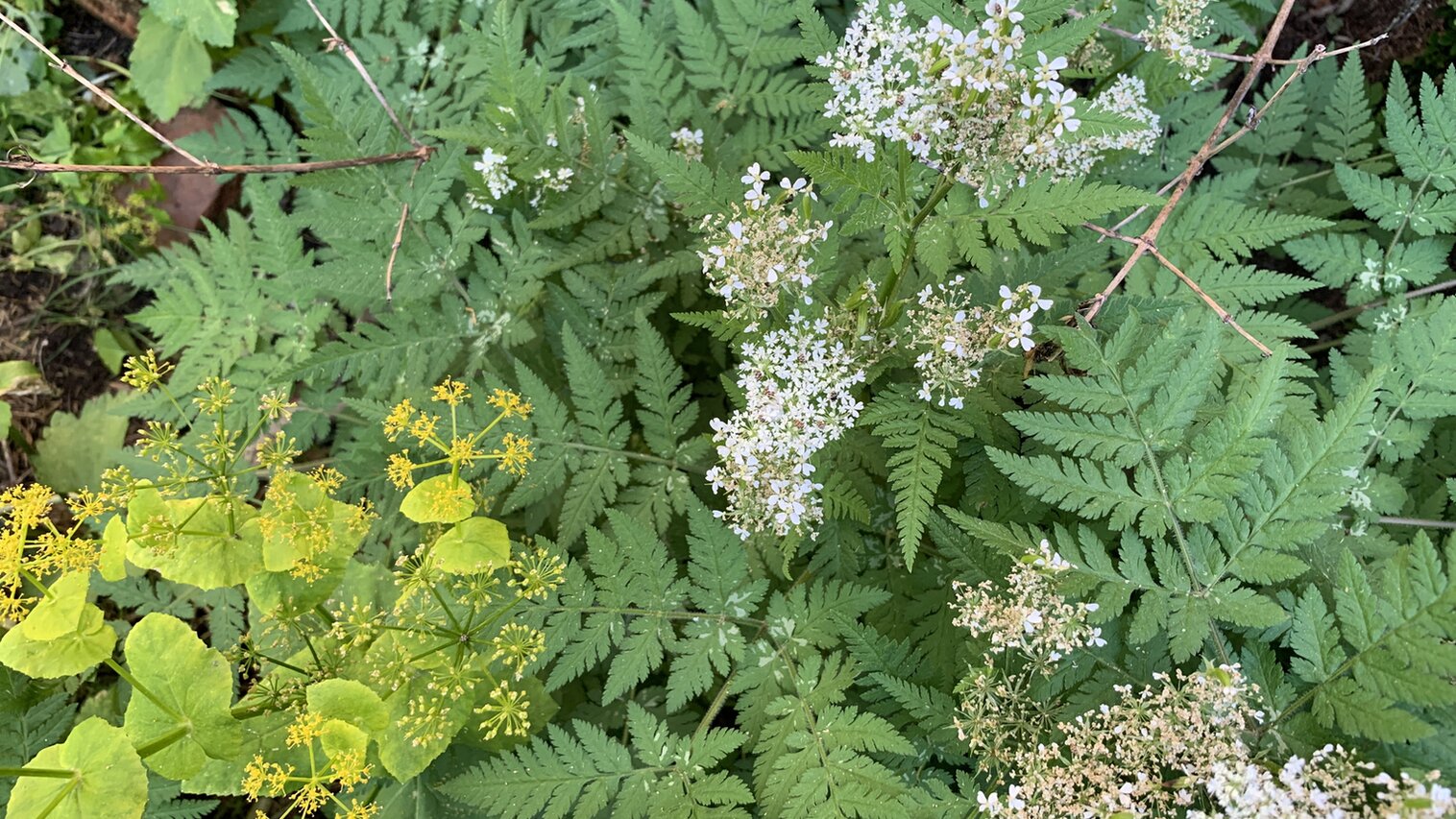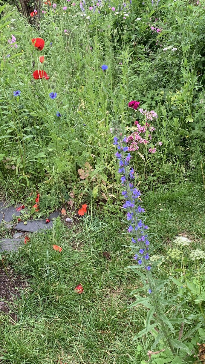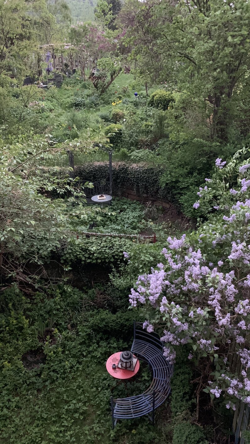 Ich versuche jetzt mal Bäume und Sträucher und so alles aufzuzählen, ohne Garantie auf Vollzähligkeit: im Hof gibt es einen Holunder, alten Flieder, eine frühblühende Zierkirsche, eine Mispel, eine Feige, sommerflieder( hier ist es zu kalt, dass er invasiv werden könnte), eine Wildrose, eine Rambler, ein ilex, Buchs, Efeu, eine Pfeifenwinde, 2 Klematis, Farne, Efeu, eine Sumpfwolfsmilch, Gelbdolde, Süßdolde, Funkien, Walderdbeeren, Lavendel, bärlauch, mädesüss , storchenschnabel. Und alles an beikraut, was die Schildkröten nicht wegfuttern. Es gibt zwei Wassergefässe. Und seit Jahren erdkröten und rotbauchmolche. Der Hof ist schwierig zu fotografieren, also nur Ausschnitte. Es gibt auch hier totholz und der Hof ist zum Garten durch eine trockenmauer abgegrenzt.