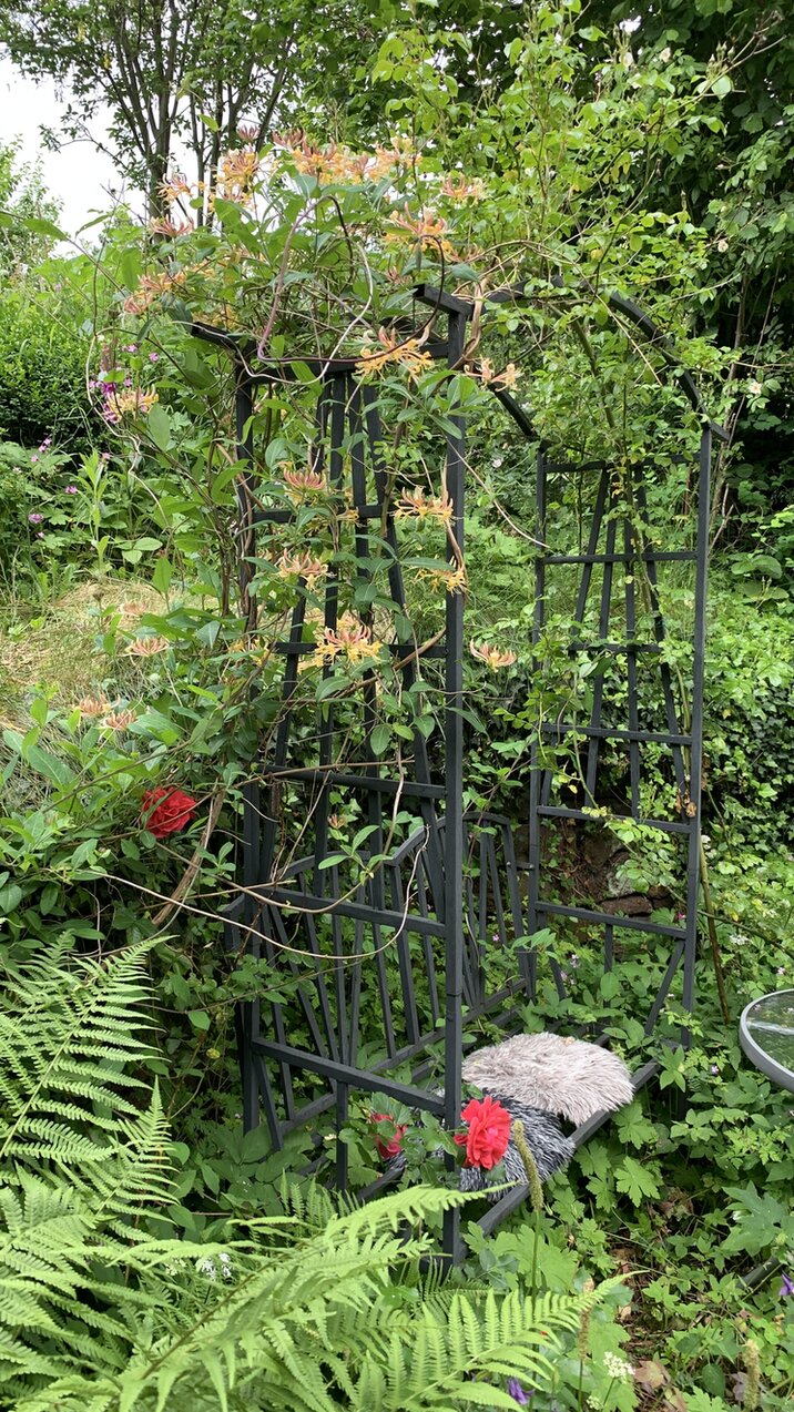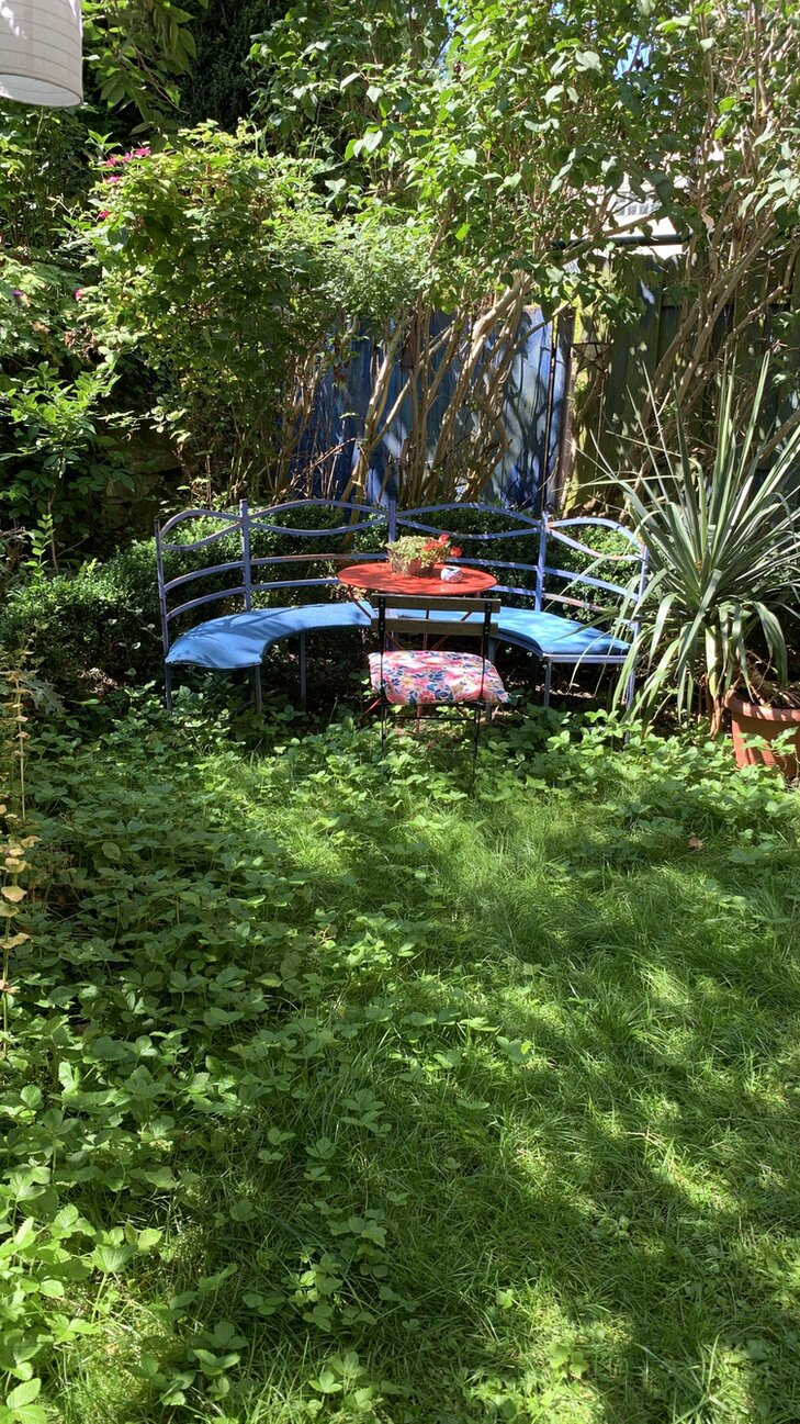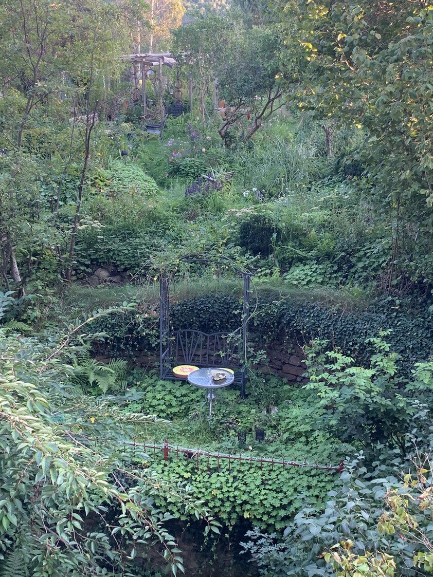 Alles toll eingewachsen, wild, grün und verwunschen! Man stelle sich als Kontrast daneben eine öde Rollrasenfläche vor... da wird noch mal richtig deutlich, wie spannend ein eingewachsener Garten mit mehreren Ebenen doch ist!
