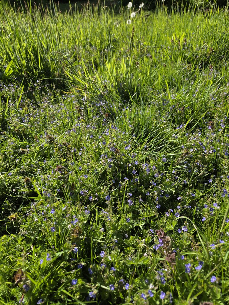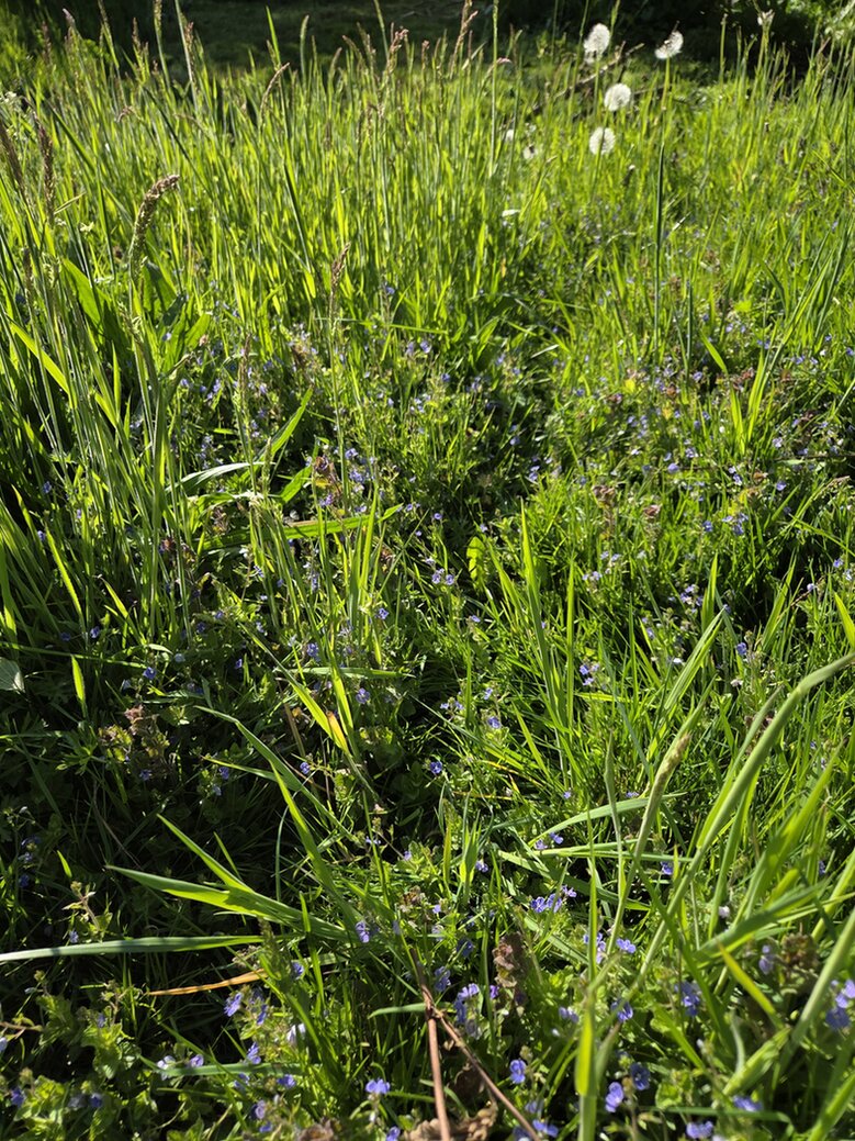 Hier: Von Natur aus niedriges Gras mit Ehrenpreis im Vordergrund, hinten hohes Gras: Gleiche Fläche, ein Schritt nach vorne zum hohen Gras: Da läßt sich nicht viel machen, oder? (Also außer die Grasnarbe zu entfernen oder ähnlich radikale Schritte.)