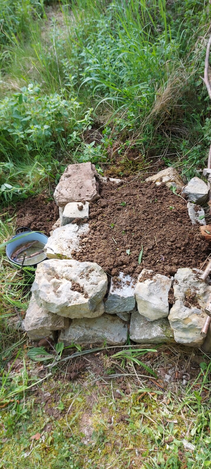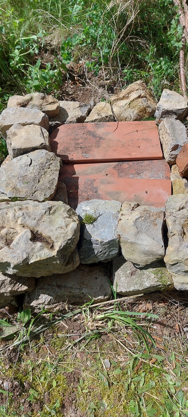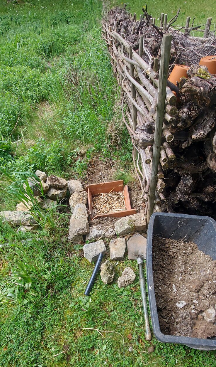 Loch ausgeben... Tonziegel rein, damit nix einstürzen tut ... Trenage machen ... Streu und Watte rein... Einflugsloch machen ... Deckel druf... Mauer außen rum ... Erde dazu und Blümchen anpflanzen ... fertig ...