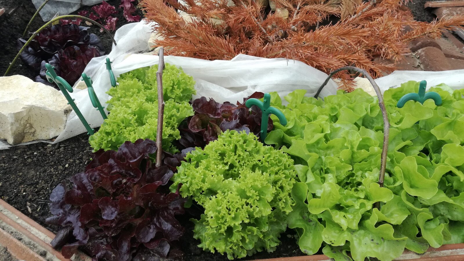 Die Ertragszone ist überschaubar. Wir sind Wohnmobilisten und da wir unsere lieben Nachbarn mit Gießen nicht überstrapazieren möchten, haben wir lediglich das aus Dachziegeln gebaute Schlüssellochbeet mit Salat und Gemüse bepflanzt. In einem kleinen Beet an der Terrasse wachsen neben Blumen auch Küchenkräuter.