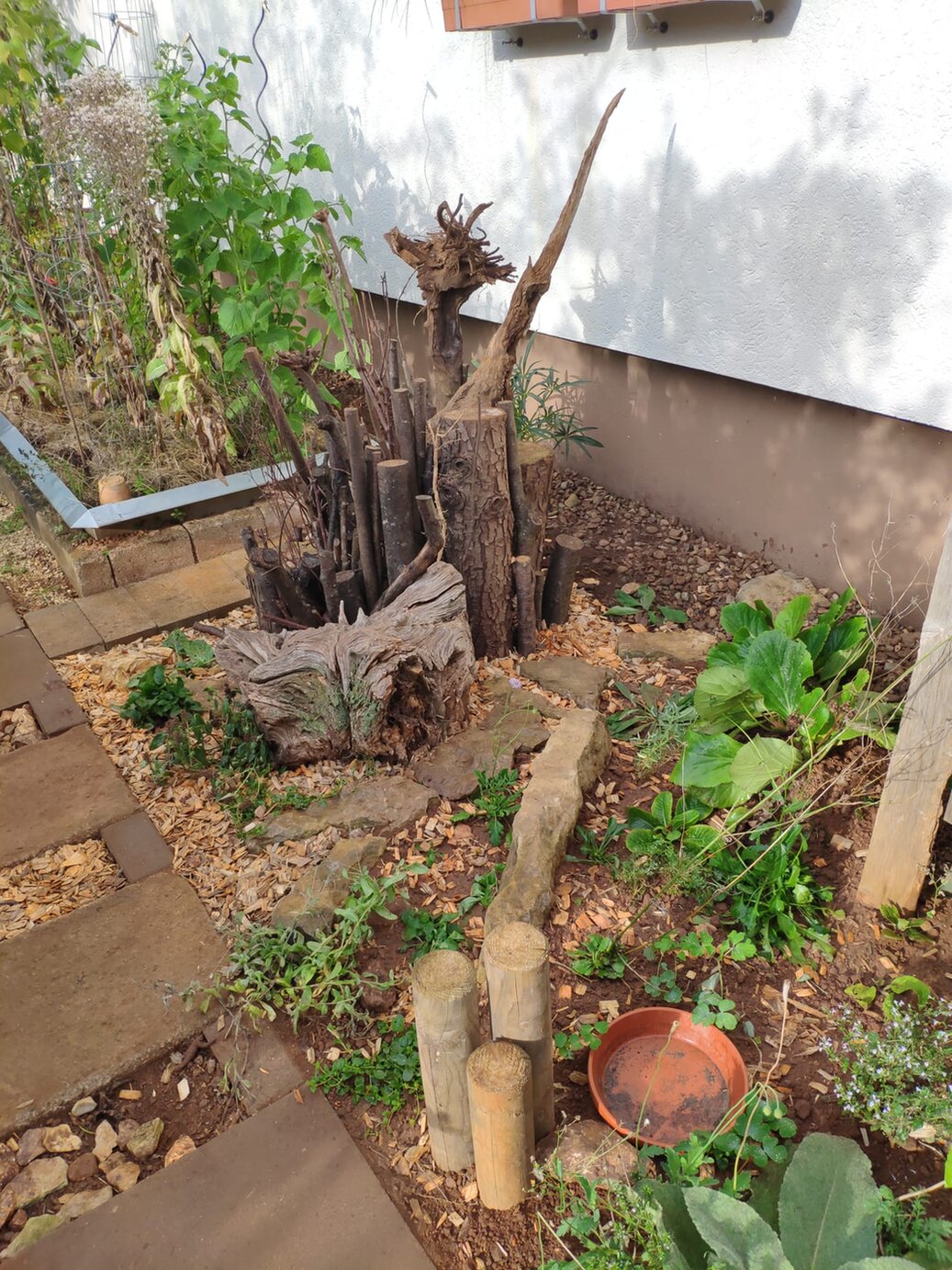 Vor etwa 25 Jahren übernahmen wir das damals schon ältere Reihenendhaus und den dazu gehörenden Garten, in den wir im Lauf der Jahre mehr und mehr heimische Pflanzen integrieren. Es zogen Trockenmauern, Insekten- und Vogelnisthilfen, Fledermauskasten, Totholz, Benjeshecke, Sumpfbeete, Sandarium, naturbelassene Ecken und ein kleiner Teich ein.