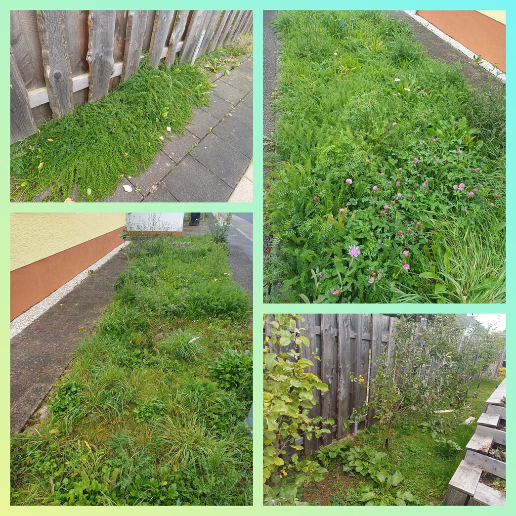 Bereits 2022 haben wir ein gut 20 qm großes Rasenstück in eine Blühwiese umgewandelt, die nur 1 oder 2 mal im Jahr gemäht wird. Hier haben wir in diesem Jahr noch eine Salweide ergänzt. Weitere Flächen im Garten werden jährlich wechselnd nicht gemäht (No-Mow-Areas). Da wir – abgesehen von der Ertragszone – seit vielen Jahren nirgendwo düngen, haben alle Flächen inzwischen eine erstaunliche Pflanzenvielfalt.