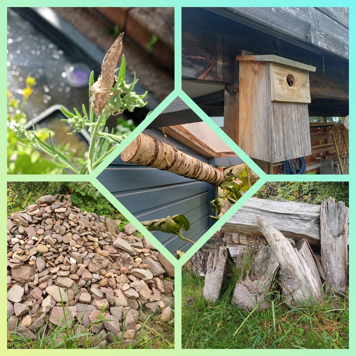 Ein Stein-, ein Totholz- sowie ein Sand-Lehm-Haufen bieten Unterschlupfmöglichkeiten für viele Tierarten. Zudem sind angebohrte (3 – 8 mm Durchmesser) Birkenstämme im gesamten Garten für Wildbienen verteilt. Für die Vögel wurden Nistkästen mit verschiedenen Lochdurchmessern aufgehängt. Als Wassermodule haben wir 3 Mini-Teiche angelegt, wovon einer ganzjährige zur Verfügung steht. In diesem Jahr konnten wir beobachten, dass sich dort Larven einer Mosaikjungfer entwickeln konnten, bis uns die leeren Hüllen die erfolgreiche Verwandlung zur Libelle verkündeten.