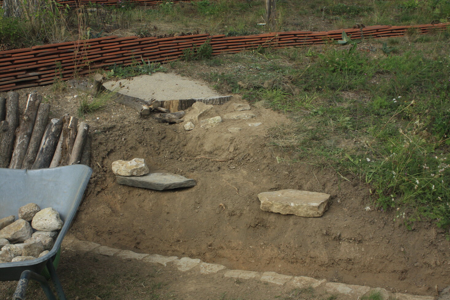 An die Mähkante kommen noch weitere Steine, die ich mit Schwertalant und Kriechendem Schleierkraut durchsetzen will.