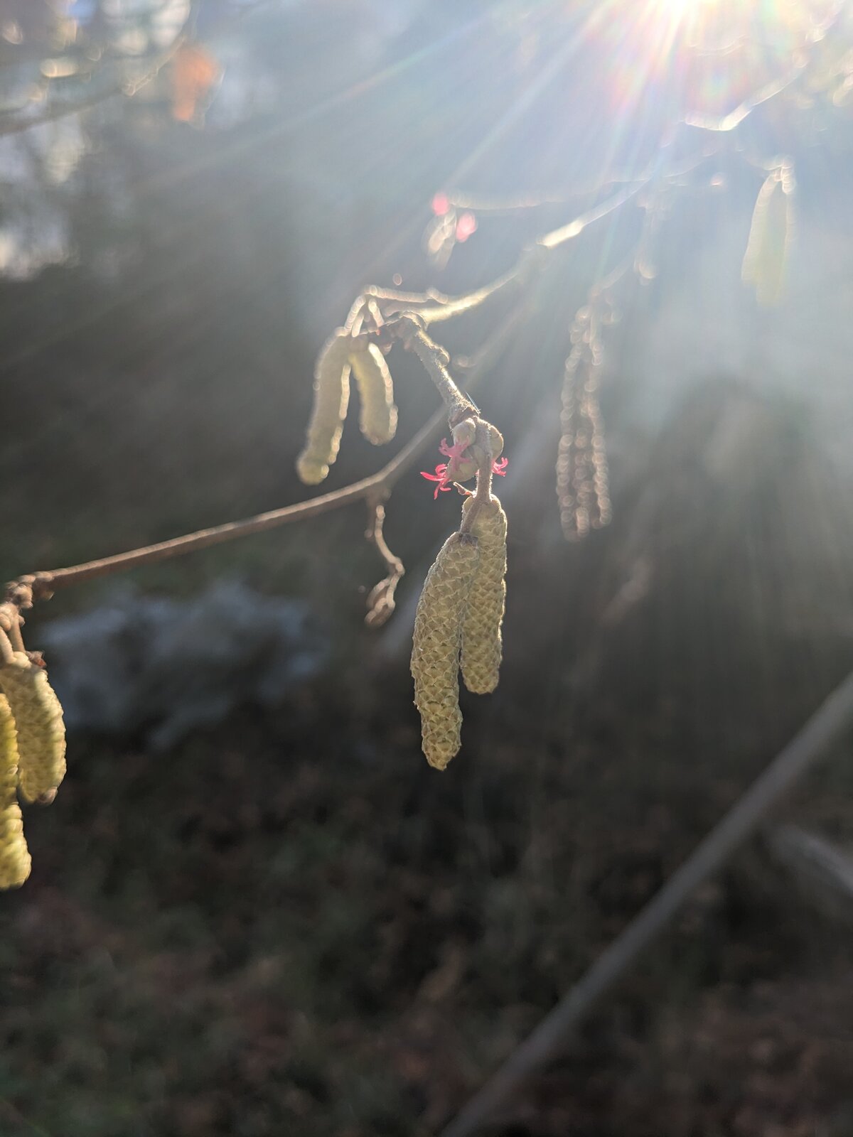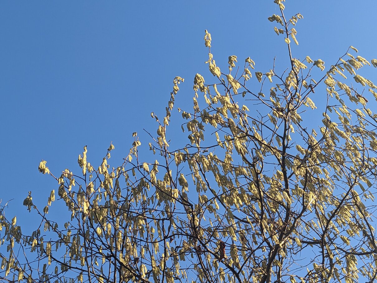 6. Auch andere Farben gibt es schon: Gelb steht die Hasel gegen den Januarhimmel. Es summt darin, wenn die Bienen auf ihren Reinigungsflügen gleich noch einen kleinen Imbiss nehmen.