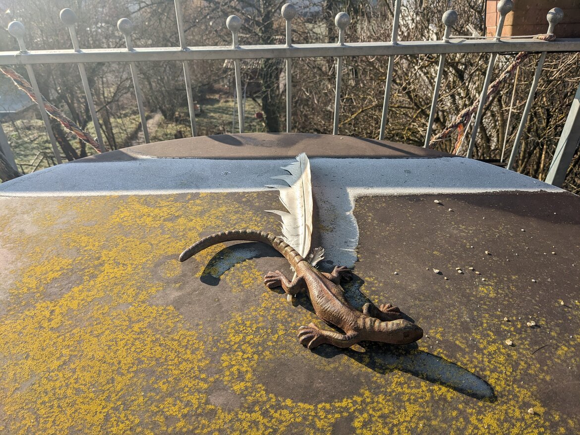 4. Die Februarsonne wärmt aber auch schon. Da freut sich meine eiserne Ganzjahres-Eidechse auf dem Balkon bestimmt, und ich staune über die sonnengemalte Graphik.