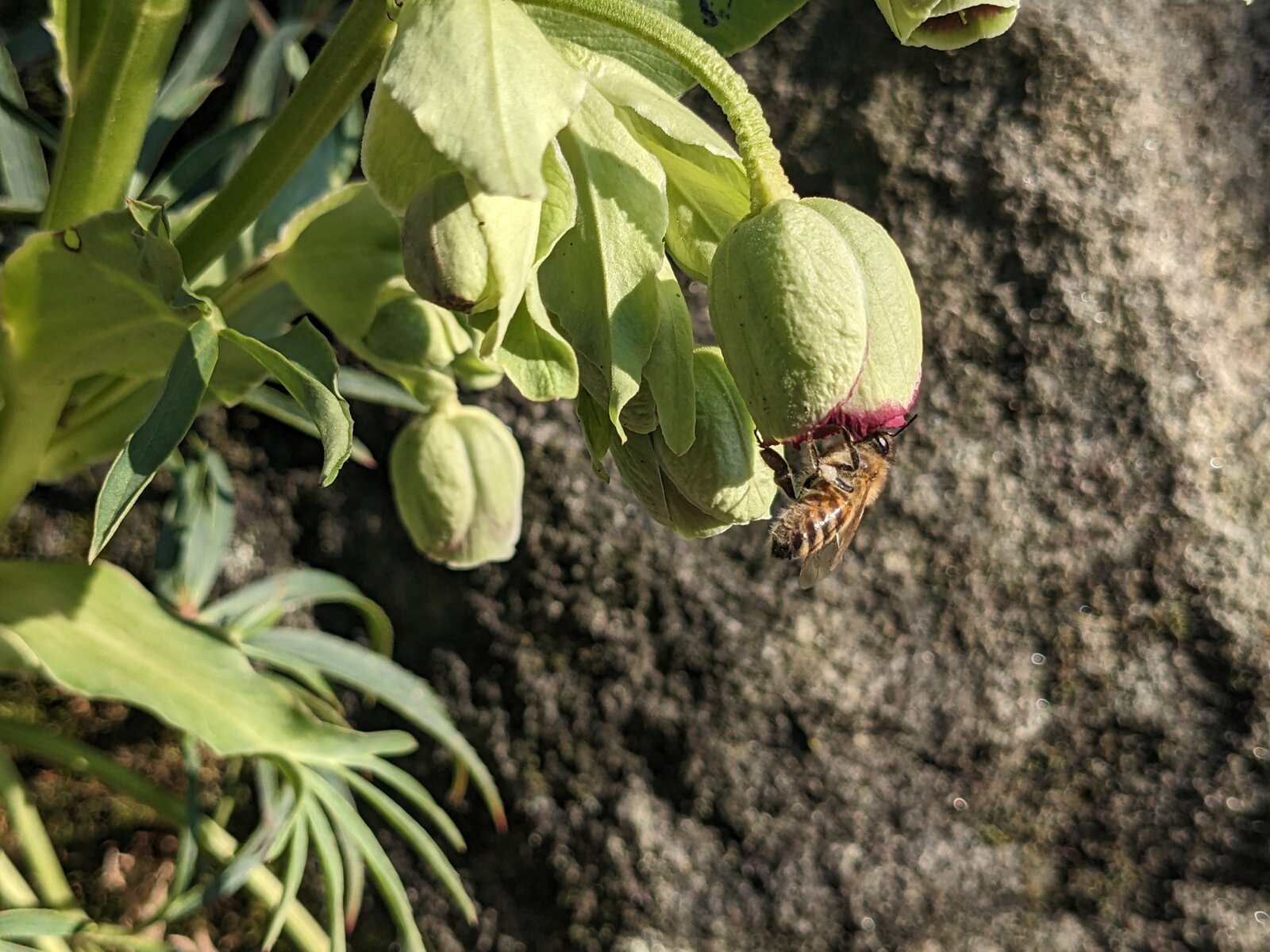 12. Natürlich blüht die Nieswurz - MONATELANG. Aber besonders im zeitigen Frühjahr ist sie insbesondere für Hummeln wichtig. In ihren Blütenkelchen ist es durch Nektarhefen mehrere Grad wärmer als außen, was die Hummeln nutzen. Hier allerdings eine Honigbiene aus Nachbars Garten.