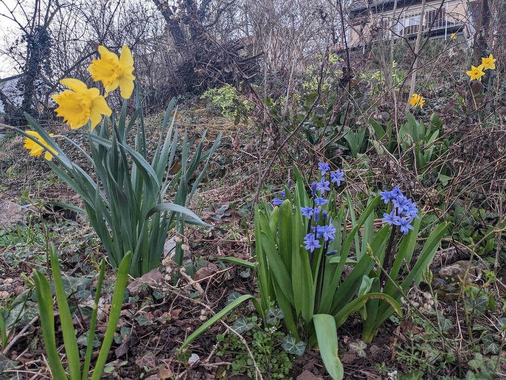 4. + 5. Mitte des Monats erblühen die Zucht-Diven nach und nach - vor dem Briefkasten Iris reticulata (hier im Schafgarbenbett), am Hang all die über die Jahre geschenkten Hyazinthen und Narzissen aus erdlosen Töpfchen, die hier weiterleben dürfen. Interessanterweise sind die Hyazinthen recht ausdauernd, verlieren aber diese starke Blütenmasse. Allerdings gefallen sie mir so besser - sieht so eher wie eine echte Pflanze aus, statt wie eine Barock-Perücke