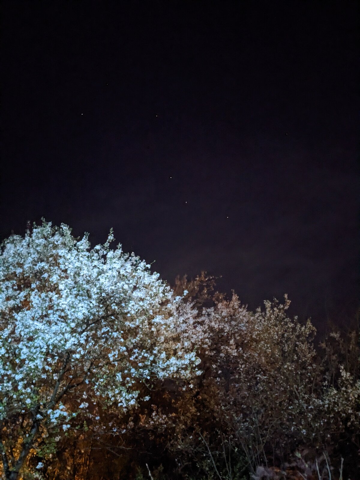 7. + 8. Das März-Highlight sind immer die Kirschpflaumen, Prunus Cerasifera. Bei gutem Wetter feiern unzählige Insektenarten dort ein Gelage. Dieses Jahr war es allerdings oft relativ trüb und die Feier ein wenig verhaltener (dem Sound nach zu urteilen). Hier ihr Leuchten in der Nacht.