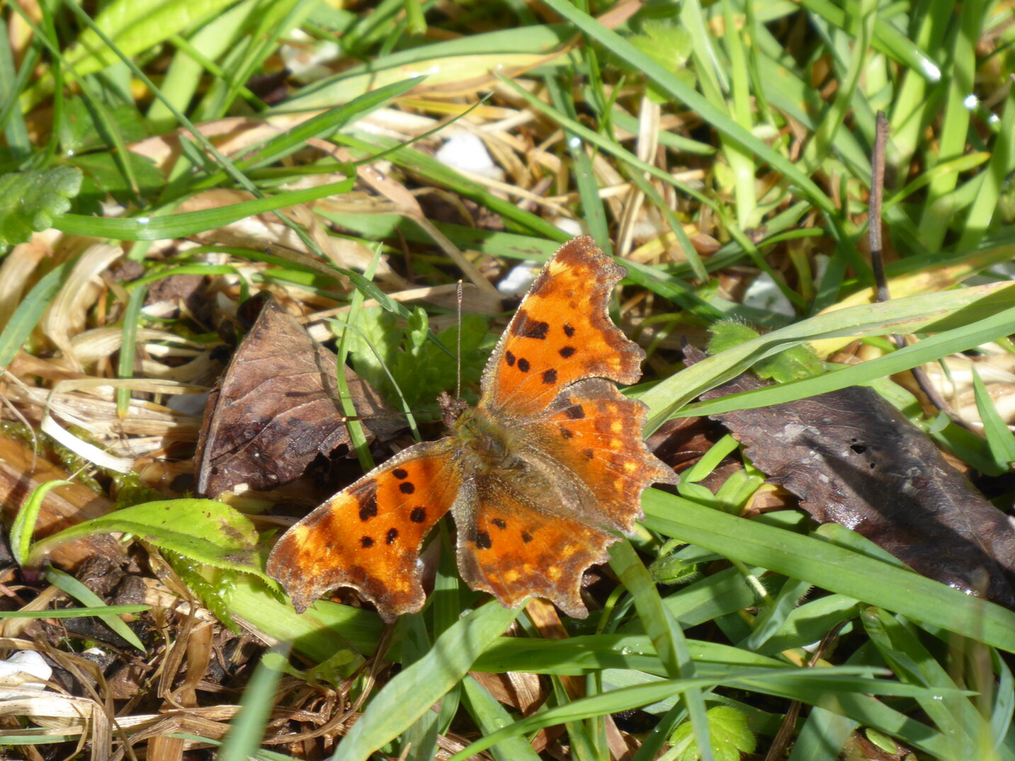 12. Nachdem ich 2022 wenig Schmetterlingen begegnet war, fand ich es ein gutes Zeichen, als im März der C-Falter im Gras saß. Sie überwintern als Falter und können daher relativ früh unterwegs sein.
