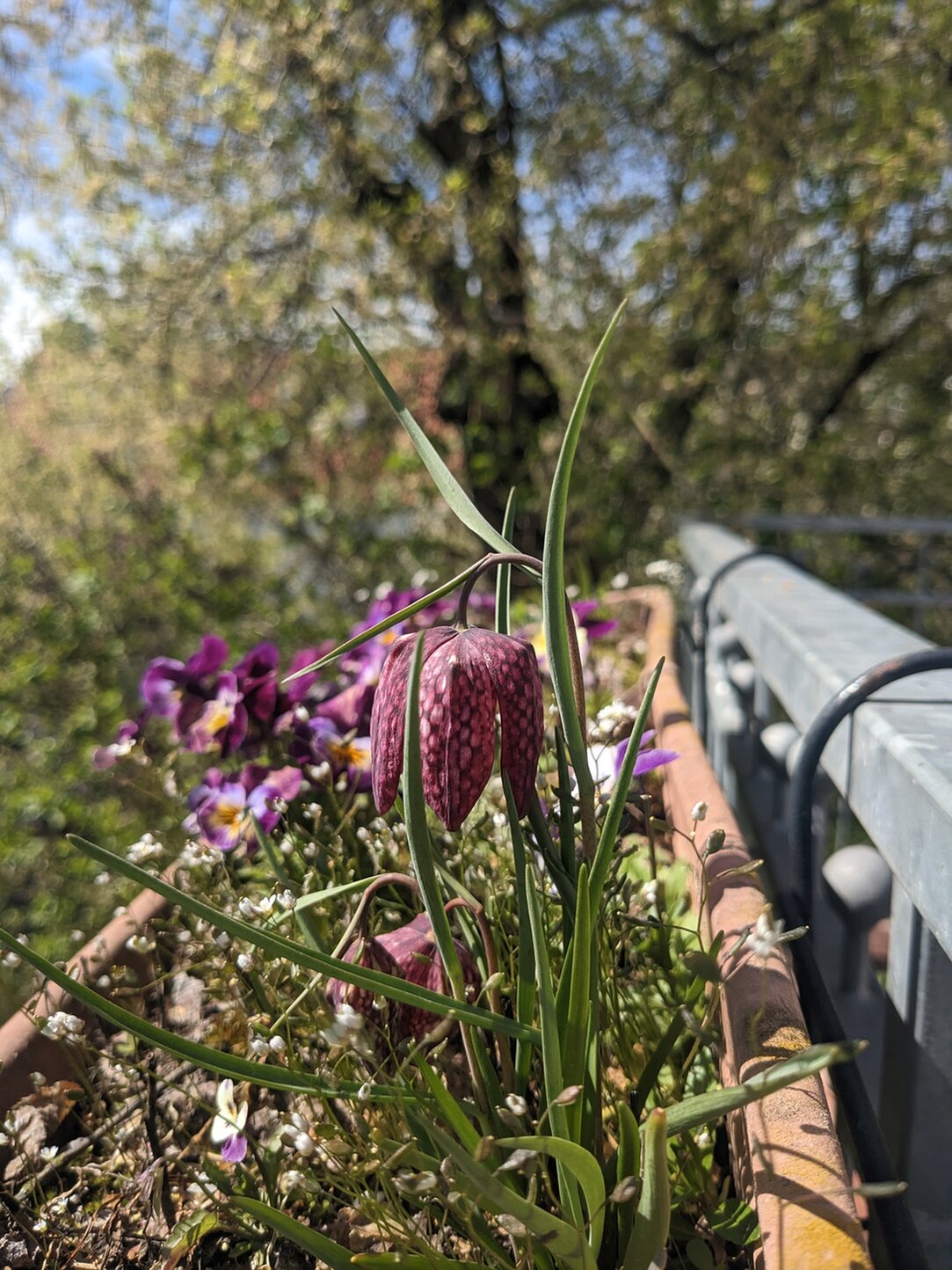 7. Im Überraschungsbalkonkasten blüht die Schachbrettblume (deren Knöllchen habe ich allerdings absichtlich hineingesteckt). Ich bin immer wieder überrascht, dass es diese Blume "in echt" gibt und sie keine Erfindung niederländischer Maler des 17. Jahrhunderts ist. Ich beneide ja @Tidofelder für seine prachtvolle Feuchtwiese, auf der sie gedeihen.