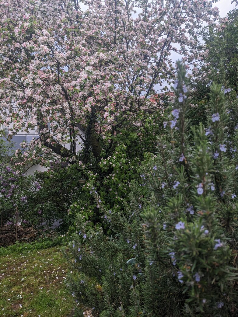2. Die Wildkirsche hat den Blüh-Stab weitergereicht an den Apfelbaum (und Rosmarin). Er blüht schön, ist aber leider moniliageplagt.