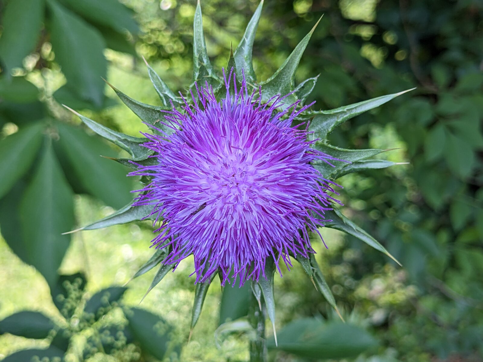 20. Und am Ende des Monats ist die erste Blüte der Mariendistel da! Sie hat es geschafft, den Schnecken zu trotzen.