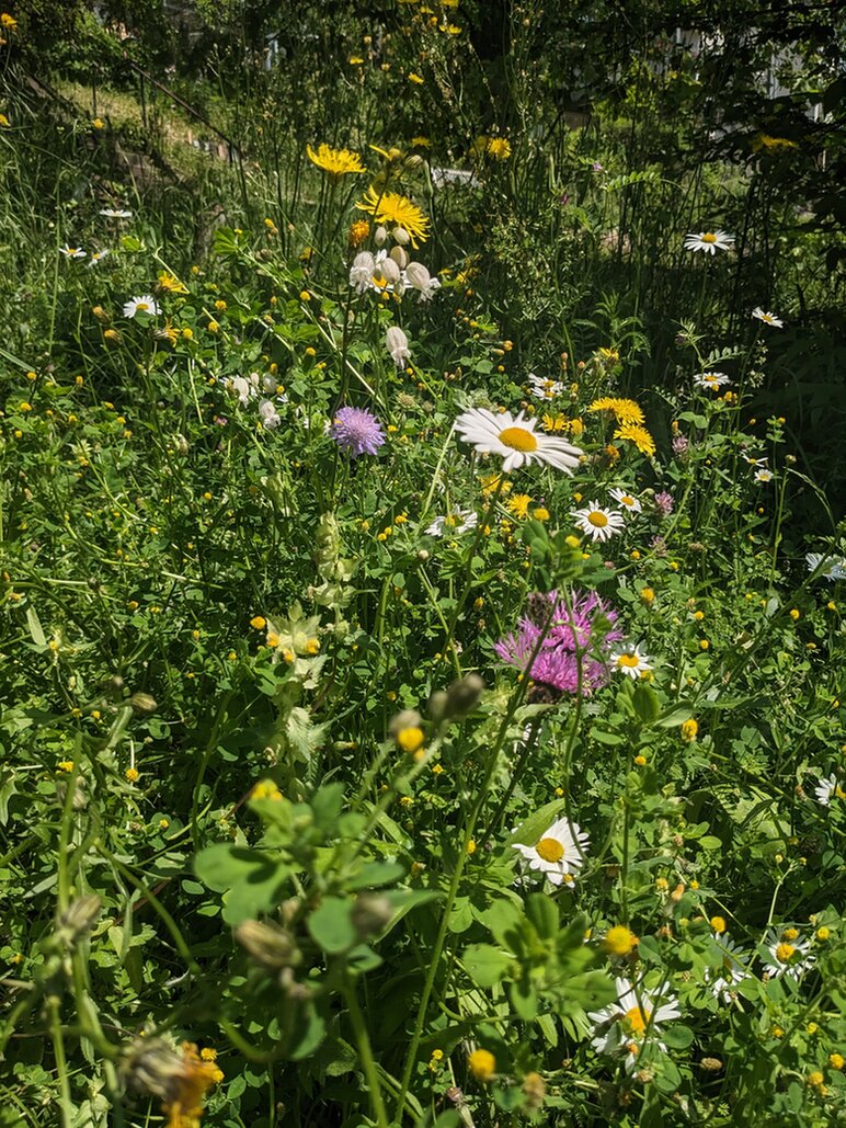 2. Ich bin immer wieder überrascht, dass es jedes Jahr unvermutet einzelne "Massentrachten" gibt. Dieses Jahr gibt es z. B. ganz viel Taubnessel (die Blätter dazwischen Weiße Lichtnelke, letztes Jahr zugeflogen). Andere Jahre waren voller Knoblauchsrauke oder Klettenlabkraut. Im nächsten Jahr ist es dann wieder ganz anders.
