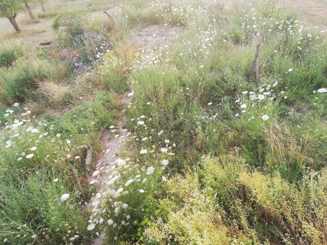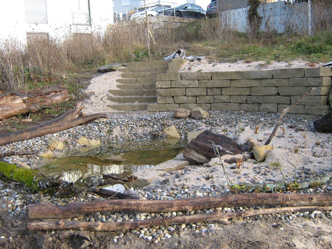 In meinem Hortus gibt es Totholzbereiche (stehend + liegend), Steinhaufen, eine junge Wildhecke (Liguster, Felsenbirne, Mispel, Weißdorn, Faulbaum, Eberesche etc.), ein Sandarium, ein Teich mit Sumpfbeet (neu) und Staudenbeete mit heimischen Pflanzen. 4 Trockenmauern fassen Magerbeete ein. Die Blumenwiese mähe ich insektenschonend mit der Sense, drei Bäume (Apfel, Feige und Pfirsich) bescheren mir leider noch keine reiche Ernte. Das Haus und der Carport haben ein Gründach. Die PKW-Stellflächen sind als Schotterrasen gestaltet. In meine beiden Nutzbeeten kann ich im Sommer Beeren, Kräuter und Gemüse ernten und meine netten Nachbarn mitversorgen.