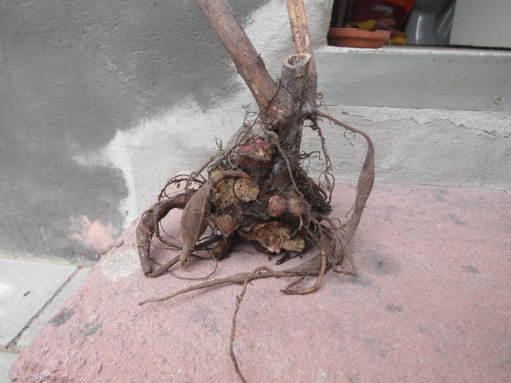 Das Lagern: in einem kühlen frostfreien (!) Raum. Die Knollen bleiben an dem ganzen Wurzelstock. Da können sich die Brutknollen gut entwickeln. Und die zu verspeisenden Knollen werden nicht durch das Abbrechen oder Abschneiden verletzt. Im Frühjahr geht es dann mit den Brutknollen weiter.