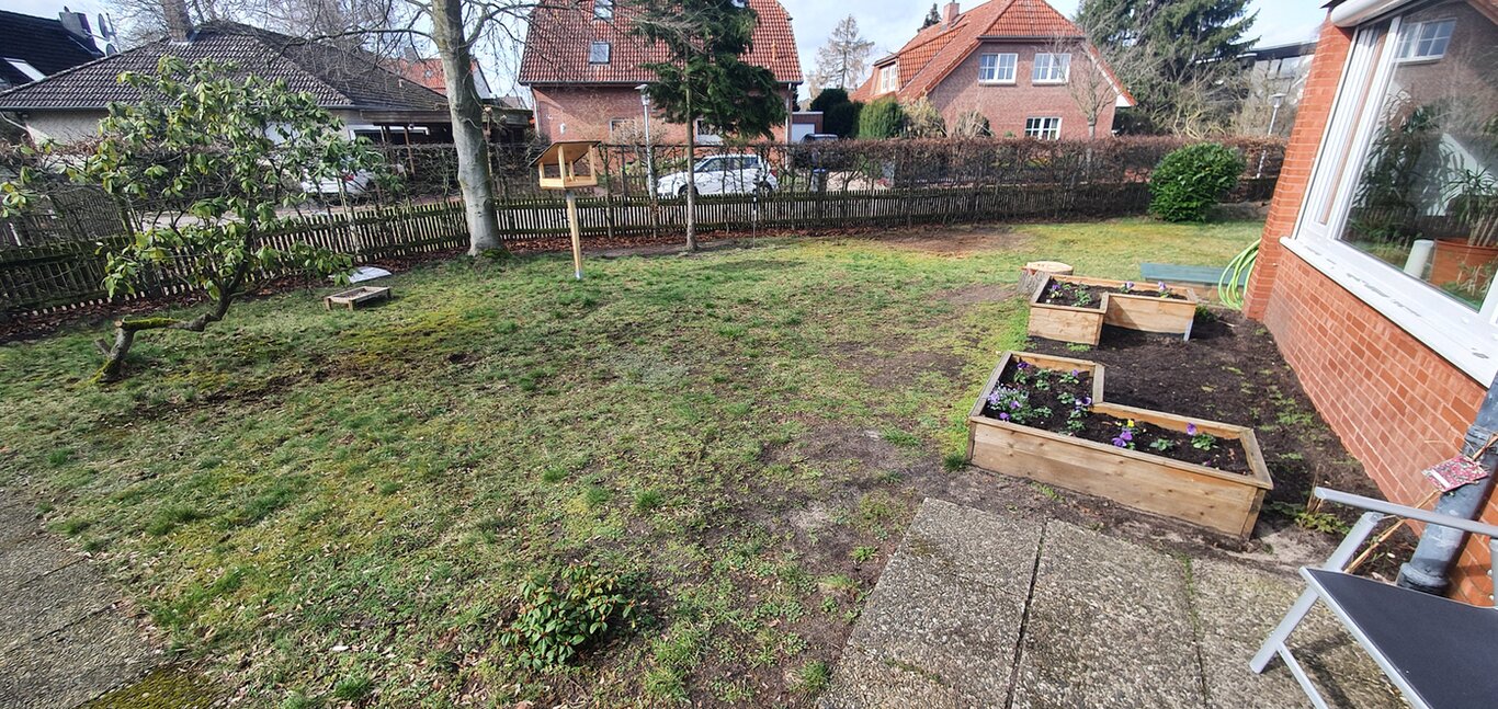Angefangen haben wir mit einer quasi unbelebten Fläche die von einer 2 m hohen Hainbuchenhecke umgeben war. Die Hecke war und ist von Anfang an unsere Pufferzone gewesen, auch wenn wir noch nicht wussten was das überhaupt ist. Im Garten fanden sich ein paar Kirschlorbeerbüsche, eine ca. 15 m hohe Blutbuche und 3 zwischen 6 und 8 m hohe Lebensbäume. Außerdem noch 2 Rhododendren (an denen der Vermieter sehr hängt) und einem ehemaligen Gemüsebeet. Außerdem befanden sich im Garten reichlich Holzklötze von 2 großen gefällten Bäumen die wir nicht mehr gesehen haben, scheinbar mindestens eine große Lärche.