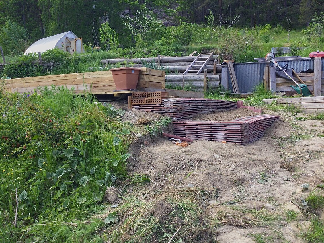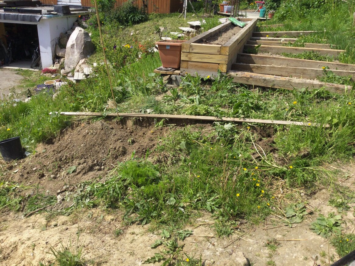 Aber jetzt ist alles Gemüse in den Boden. Auch habe ich weiter an der Gestaltung vom Gartenteil gearbeidet der hinter diesem langen Blumenkasten liegt. Hier wurden mit Hilfe von alten Dachziegeln zwei kleine Terrassen geschaffen und eine Hainbuchenhecke gepflanzt. Auch ein Pfirsichbäumchen fant hier seinen Platz. Im Abrisshaus lag noch eine alte Holzleiter. Die wurde gekappt und daraus entsteht jetzt einen Rosenportal. Dieser Durchgang soll einen Übergang markieren zwischen der Ertragszone und die Arbeidsecke. Hier steht das Gartenhäuschen mit dem Gartenwerkzeug, unzählige leere Blumentöpfe und die Kompostbehälter. Ist aber auch ein Sitzplatz wo es windgeschützt ist und gutes verweilen in der Abendsonne.